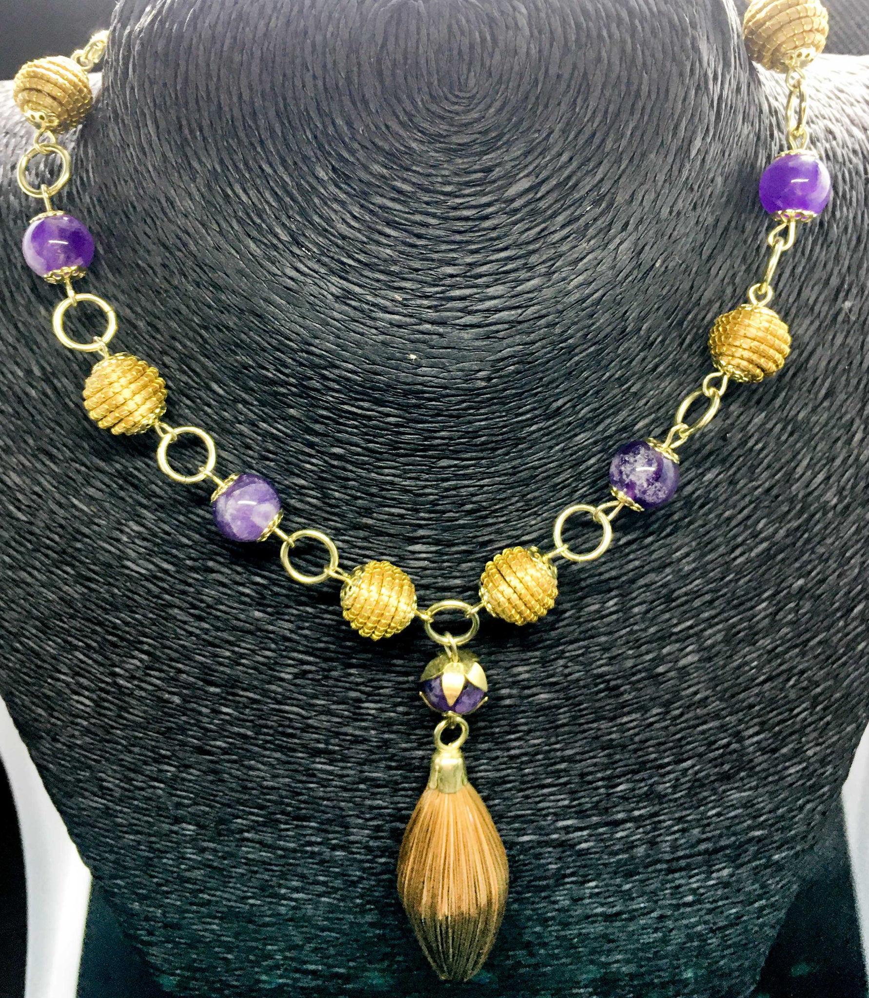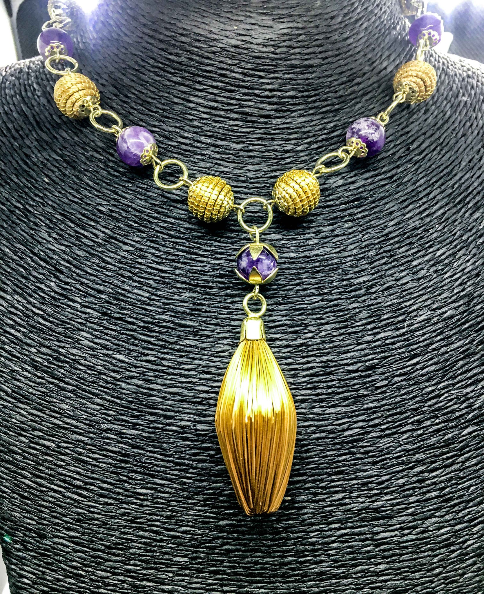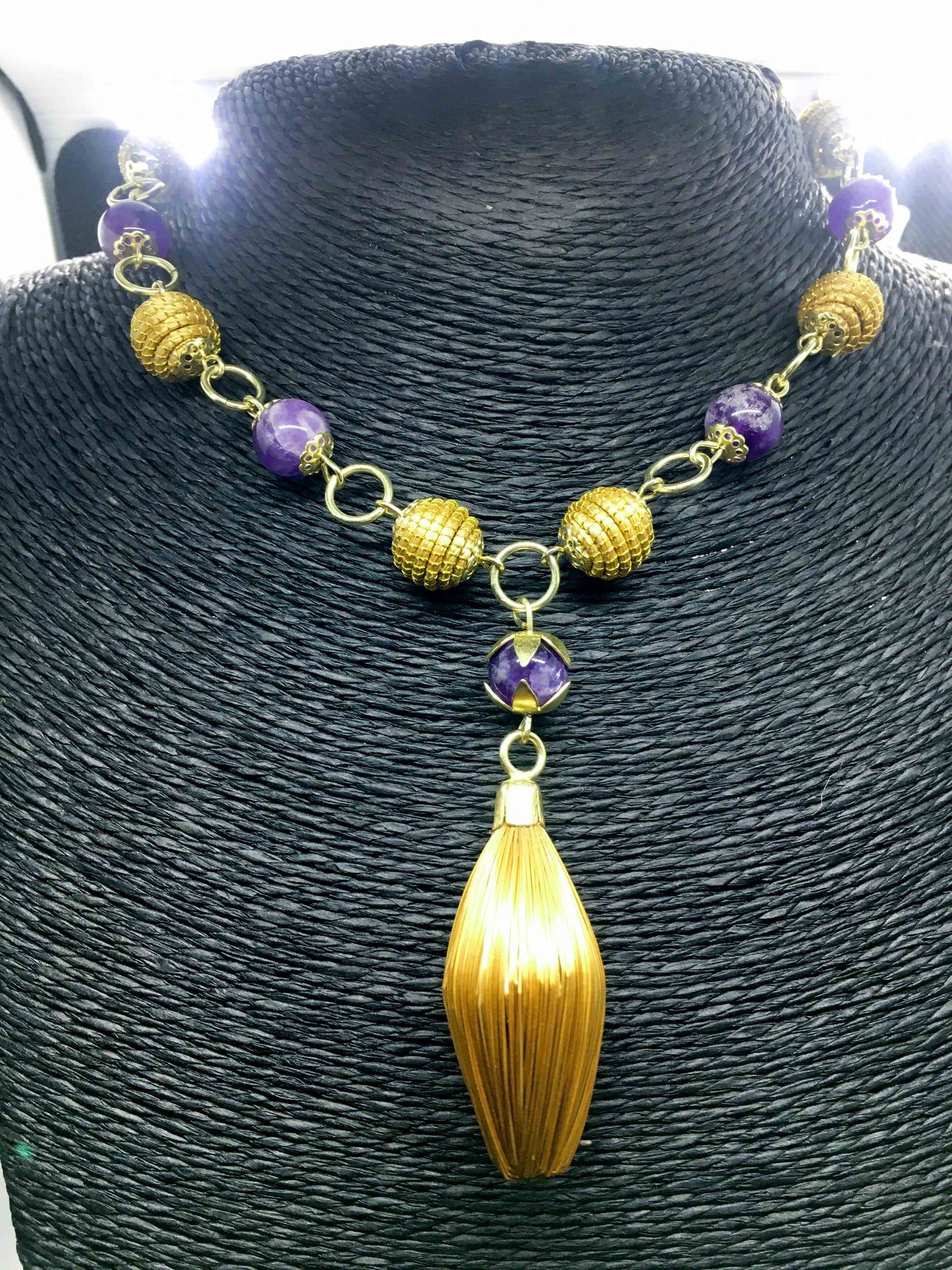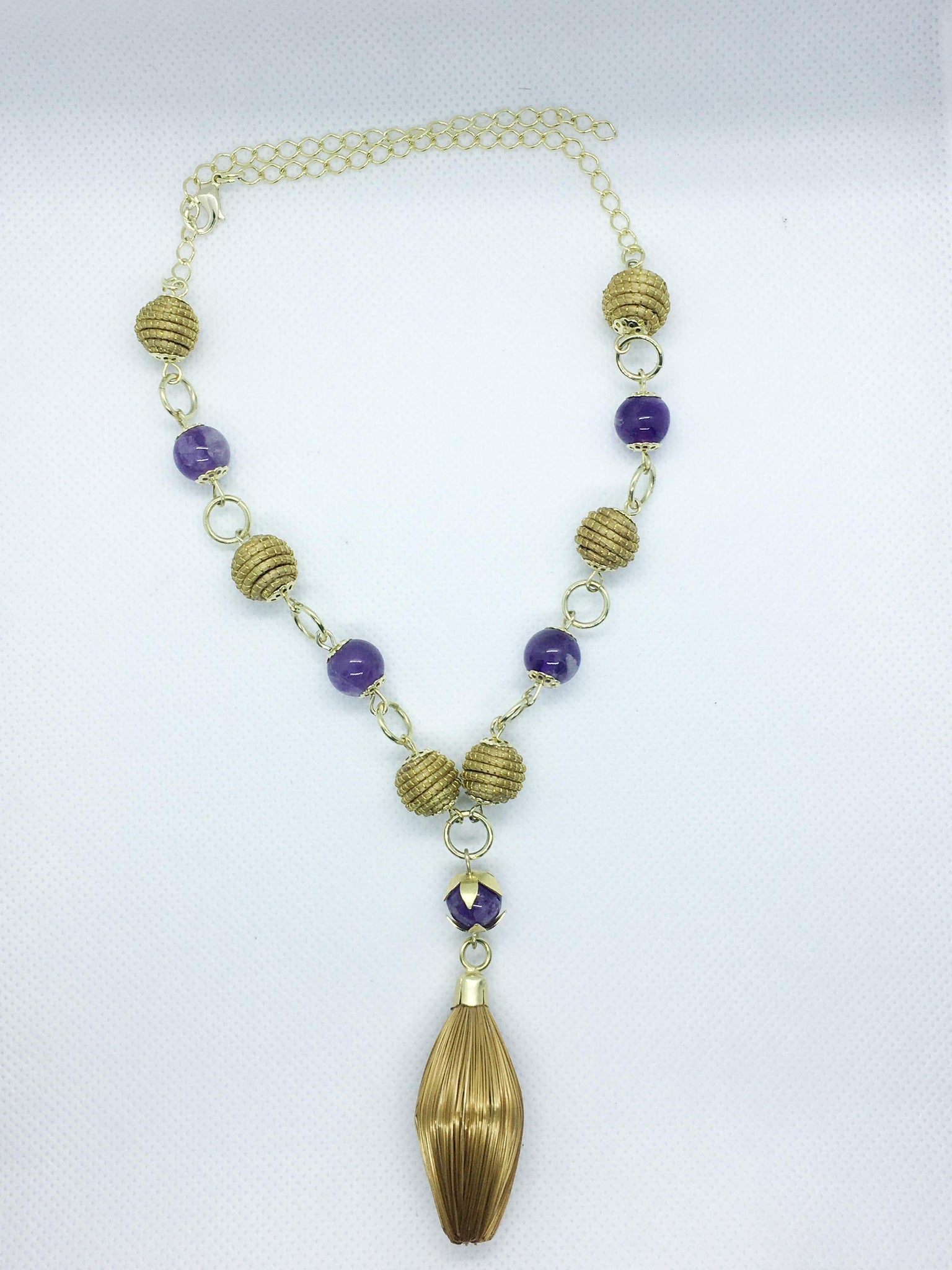 Collana girocollo com piccole palline delicate in Capim Dourado e piccole pietre tonde e lisce di ametista, ciondolo a forma di rombo in Capim  Dourado.
