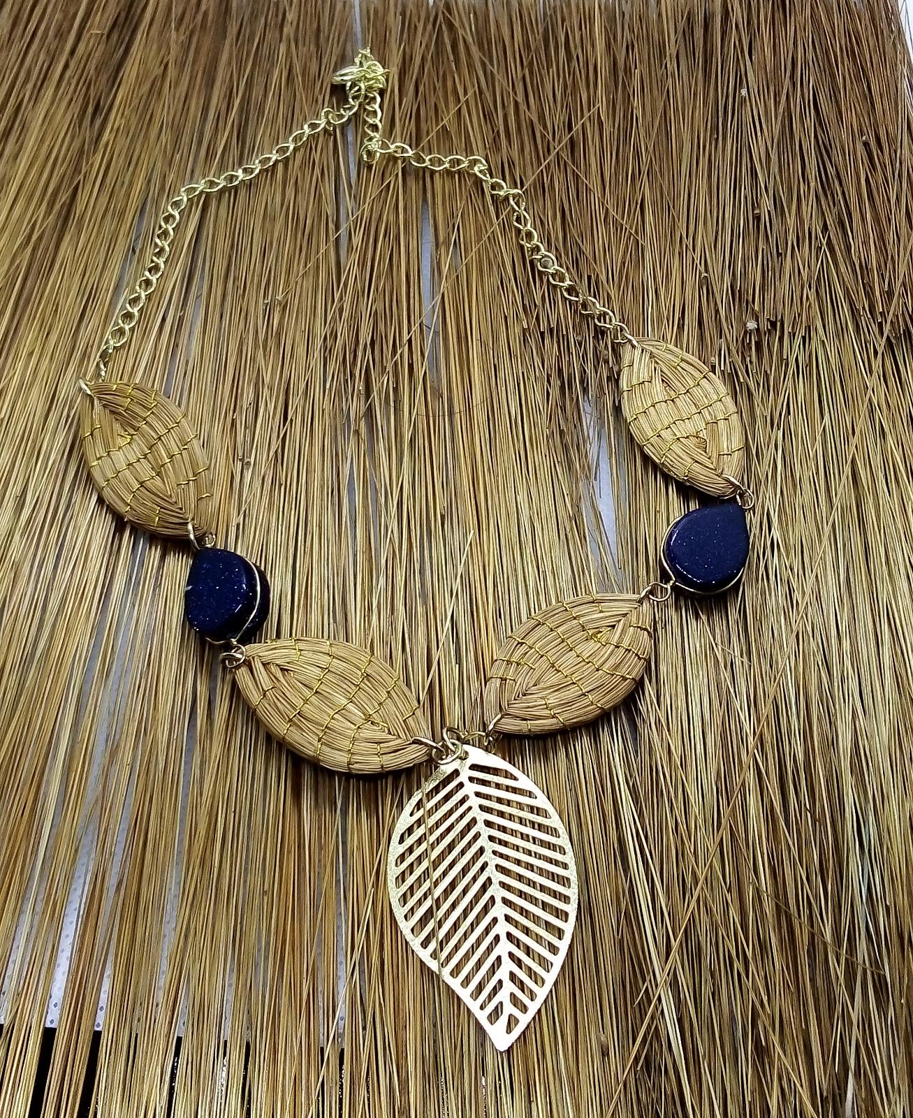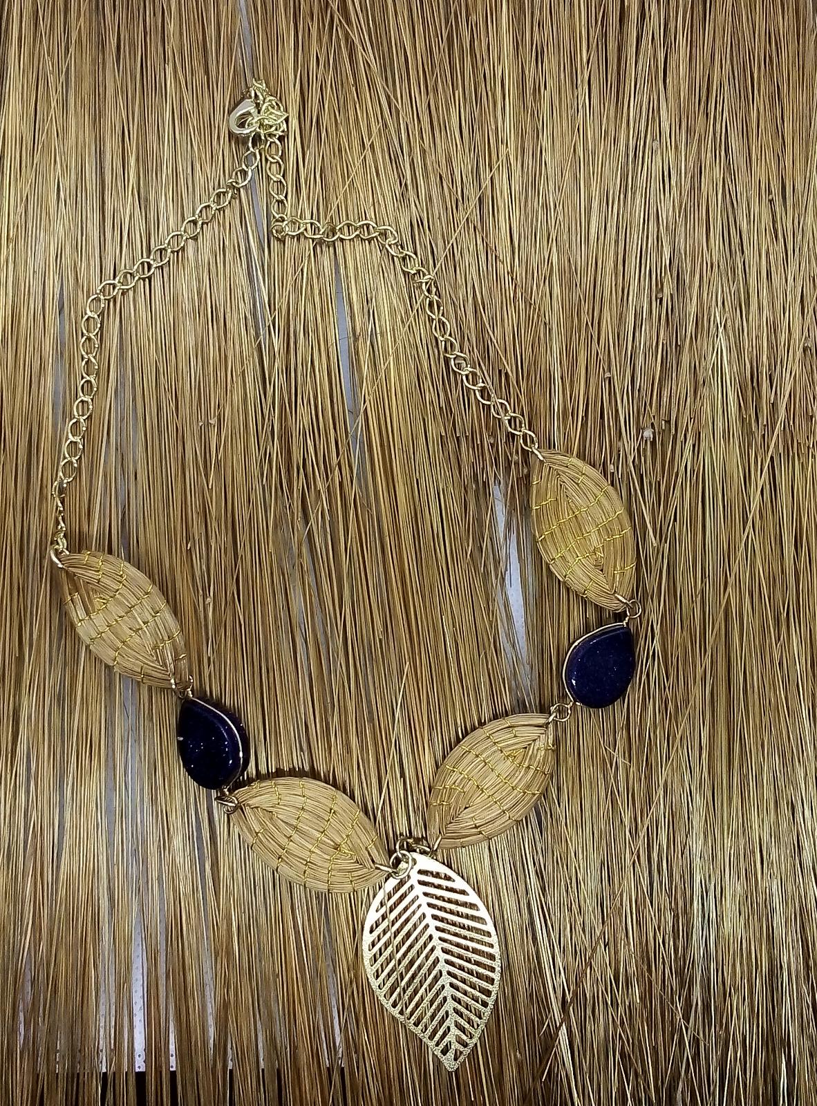 Collana girocollo In Capim Dourado a forma di foglie e pietre del sole blu piatte liscia a goccia, ciondolo a forma di foglia in ottone.