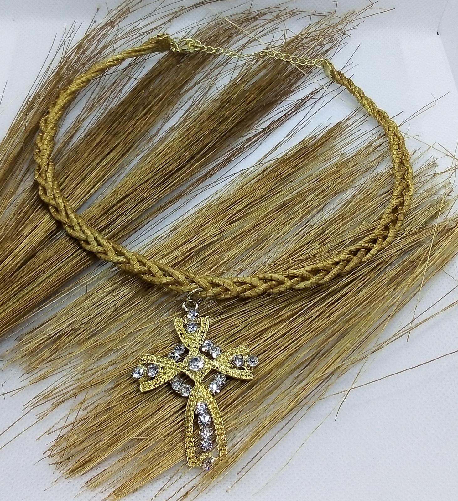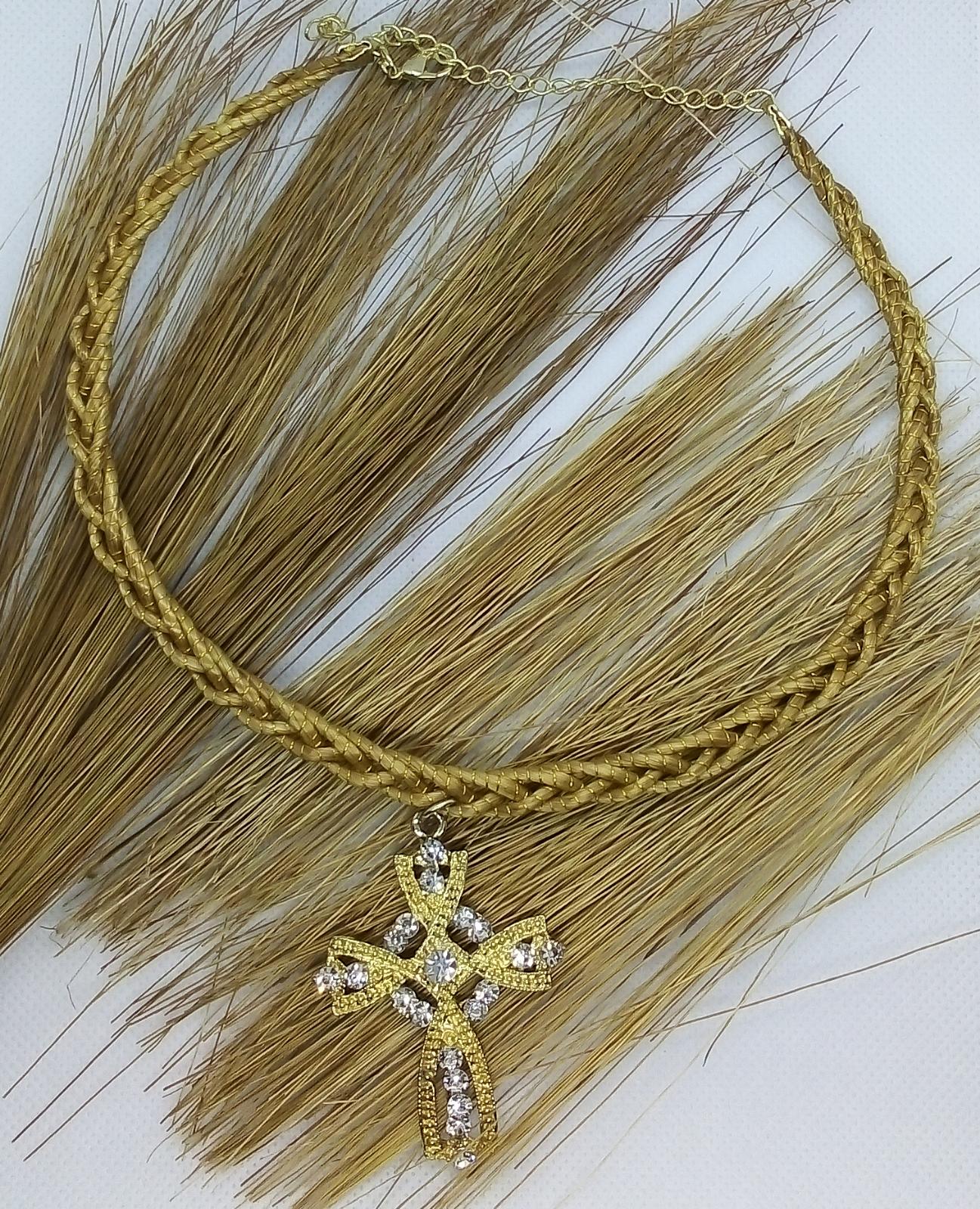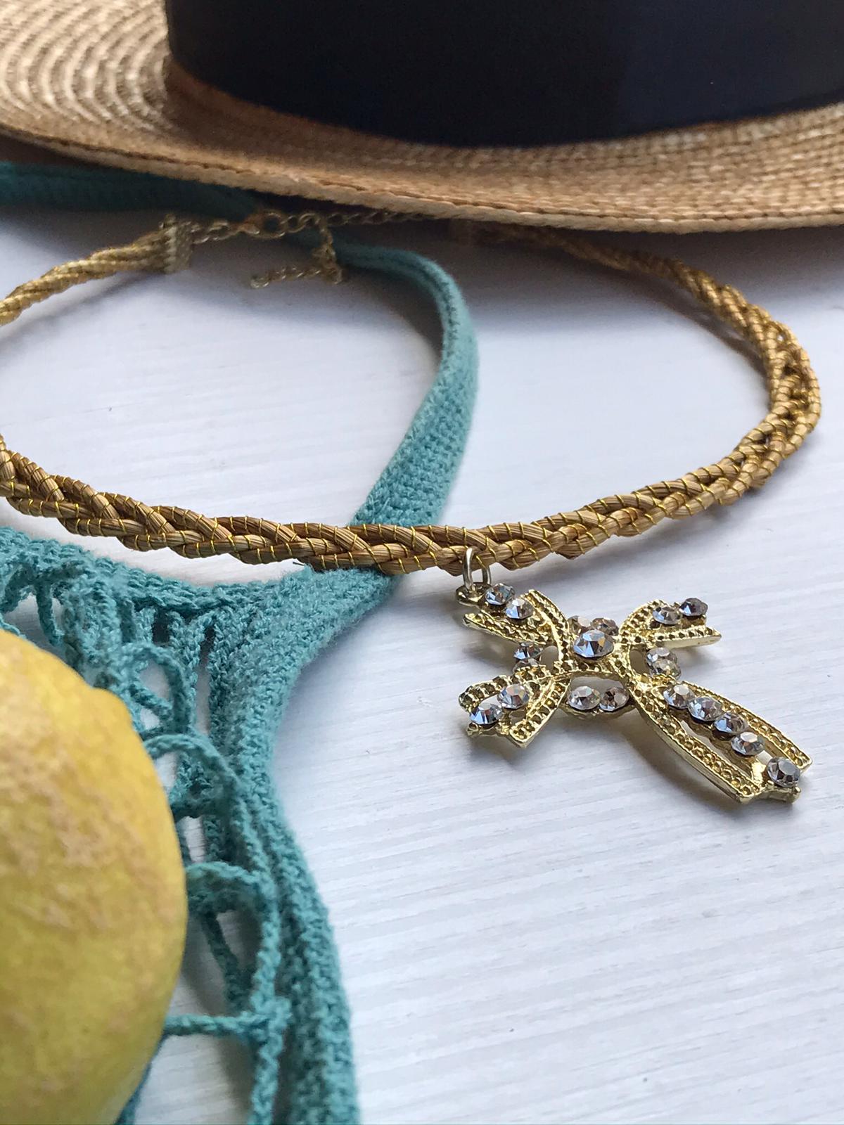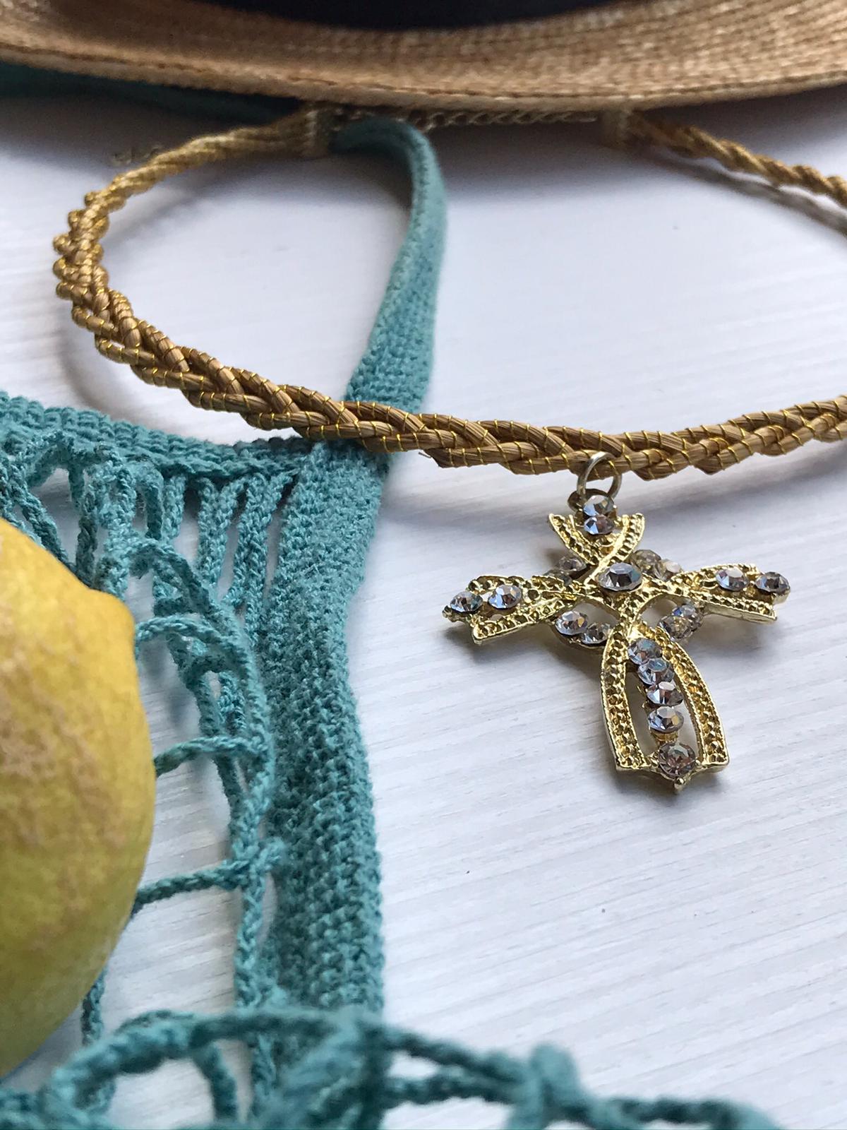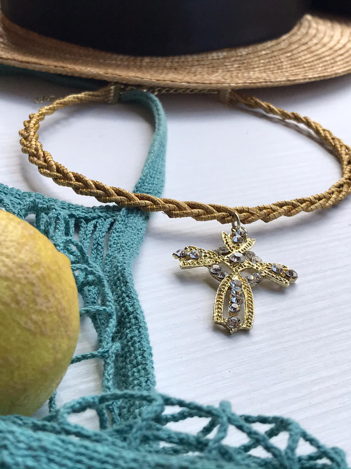 Girocollo rigido intrecciato Capim Dourado com ciondolo in croce con strass bianco