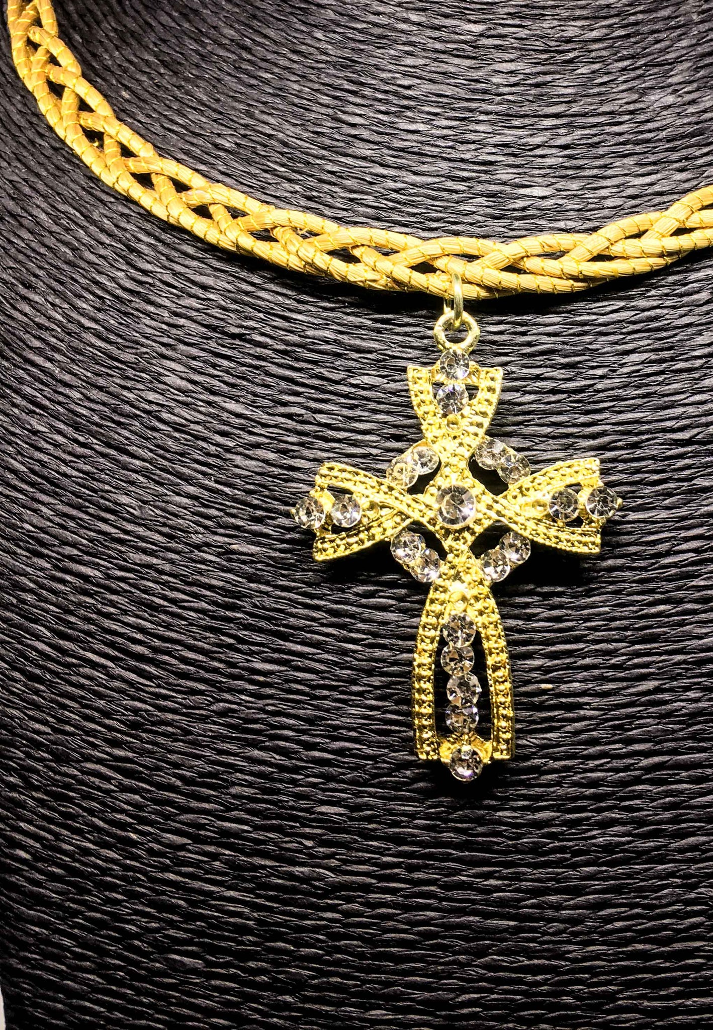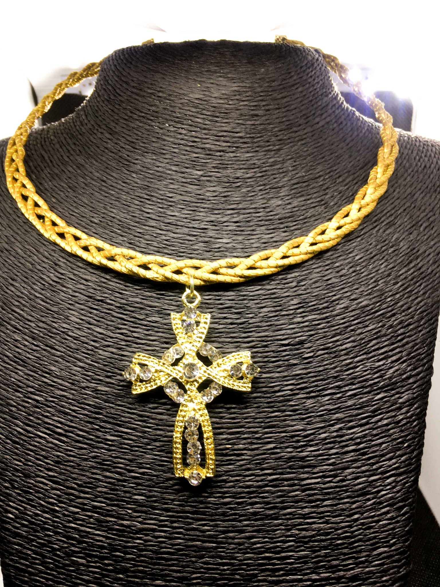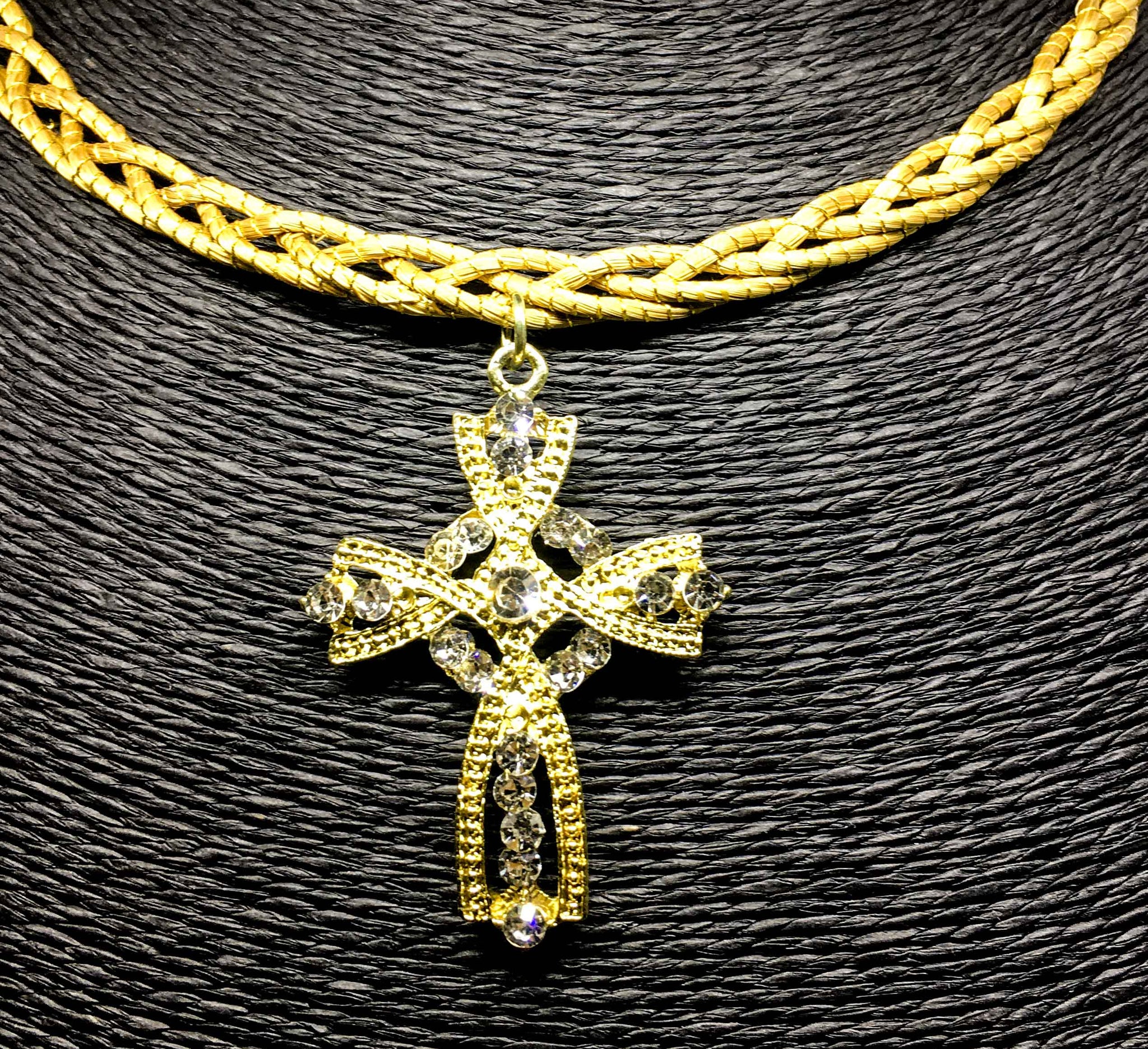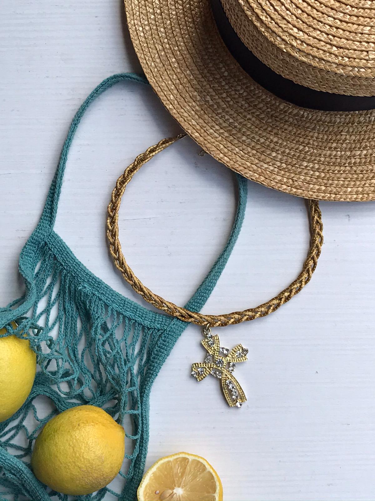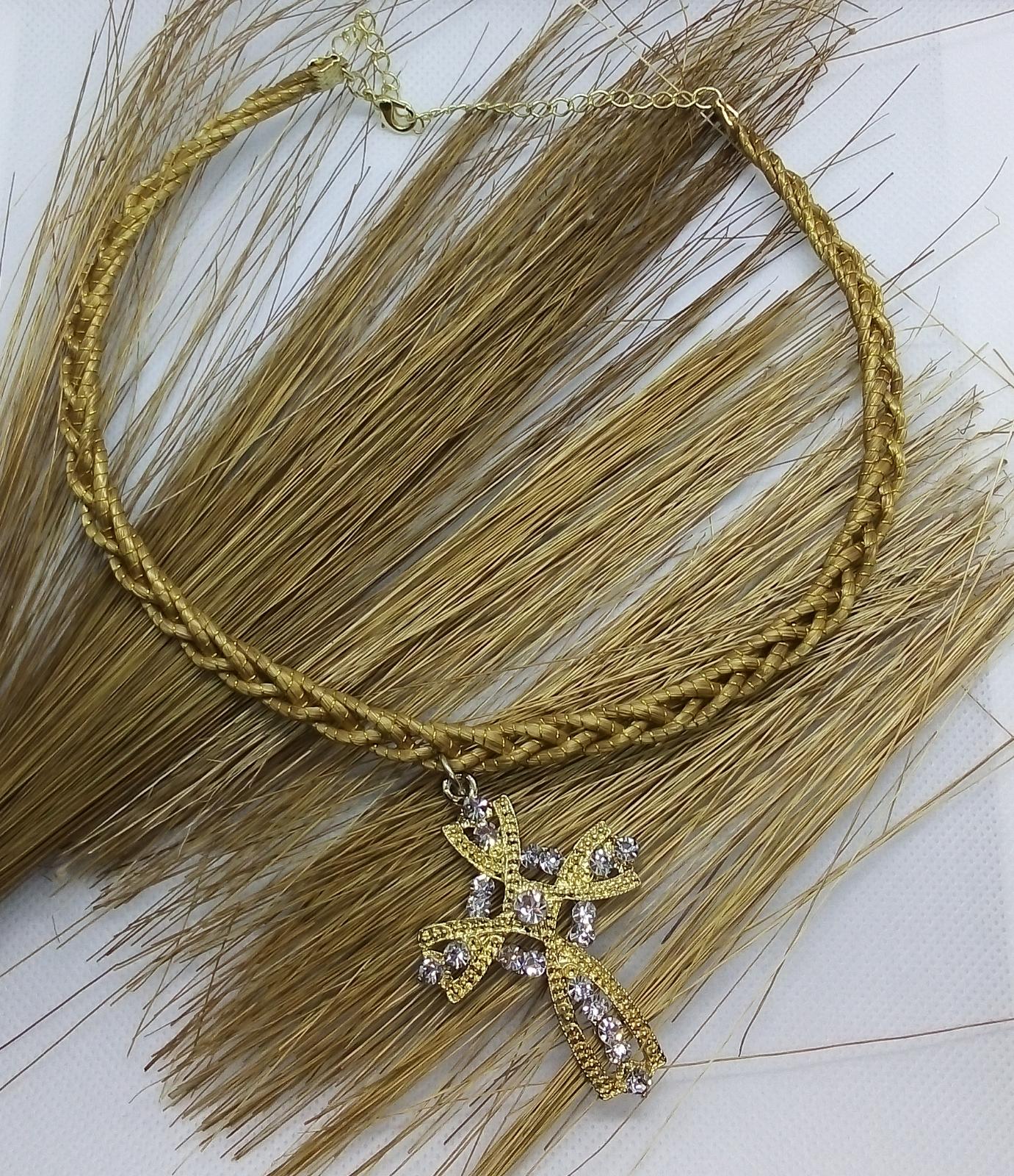Girocollo rigido intrecciato Capim Dourado com ciondolo in croce con strass bianco