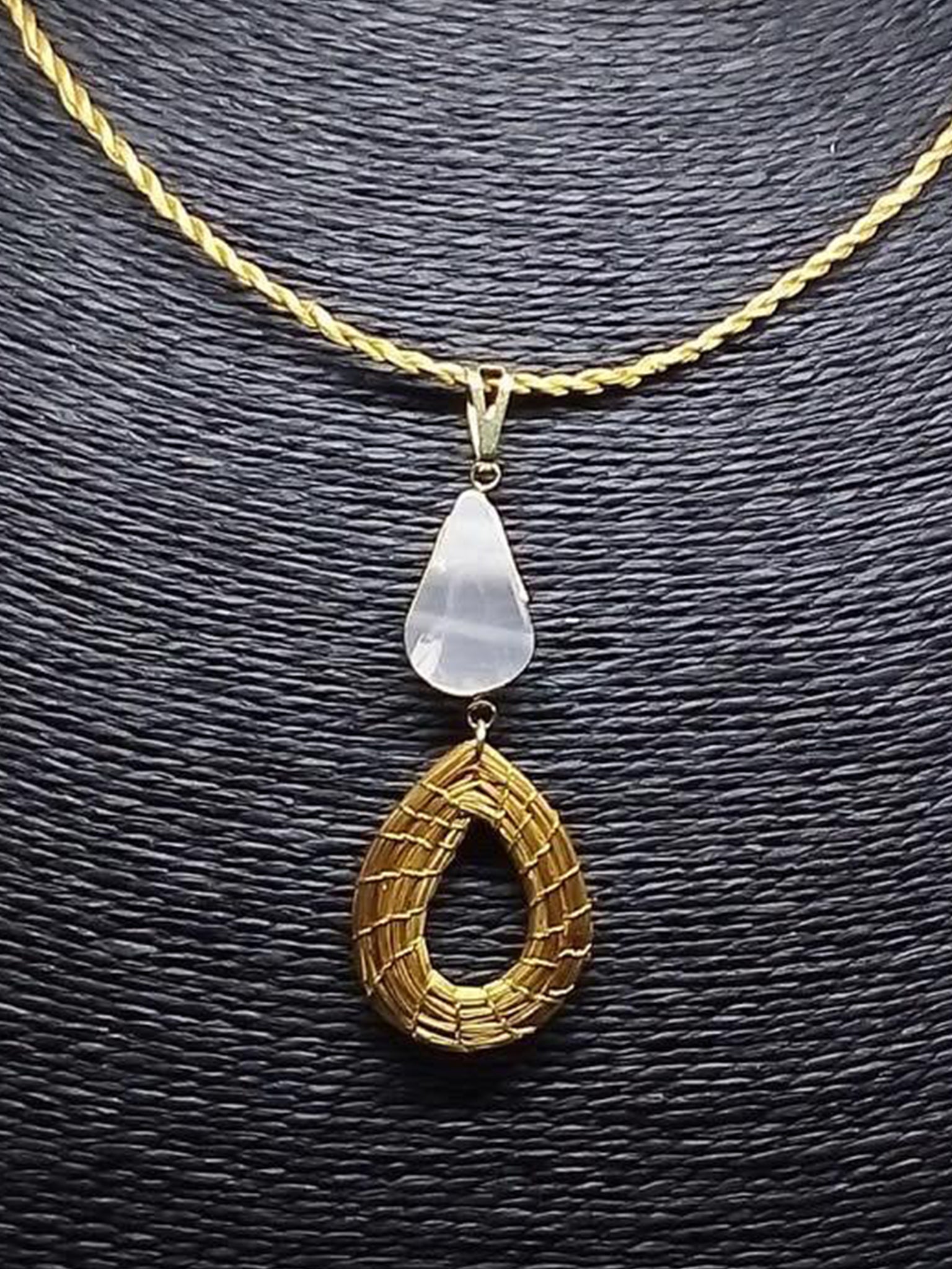 Collana girocollo in capim Dourado intrecciato delicato, ciondolo doppio con pietra selenita liscia e capim dourado a forma di goccia.