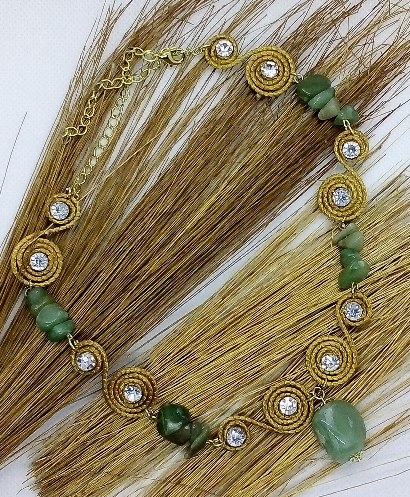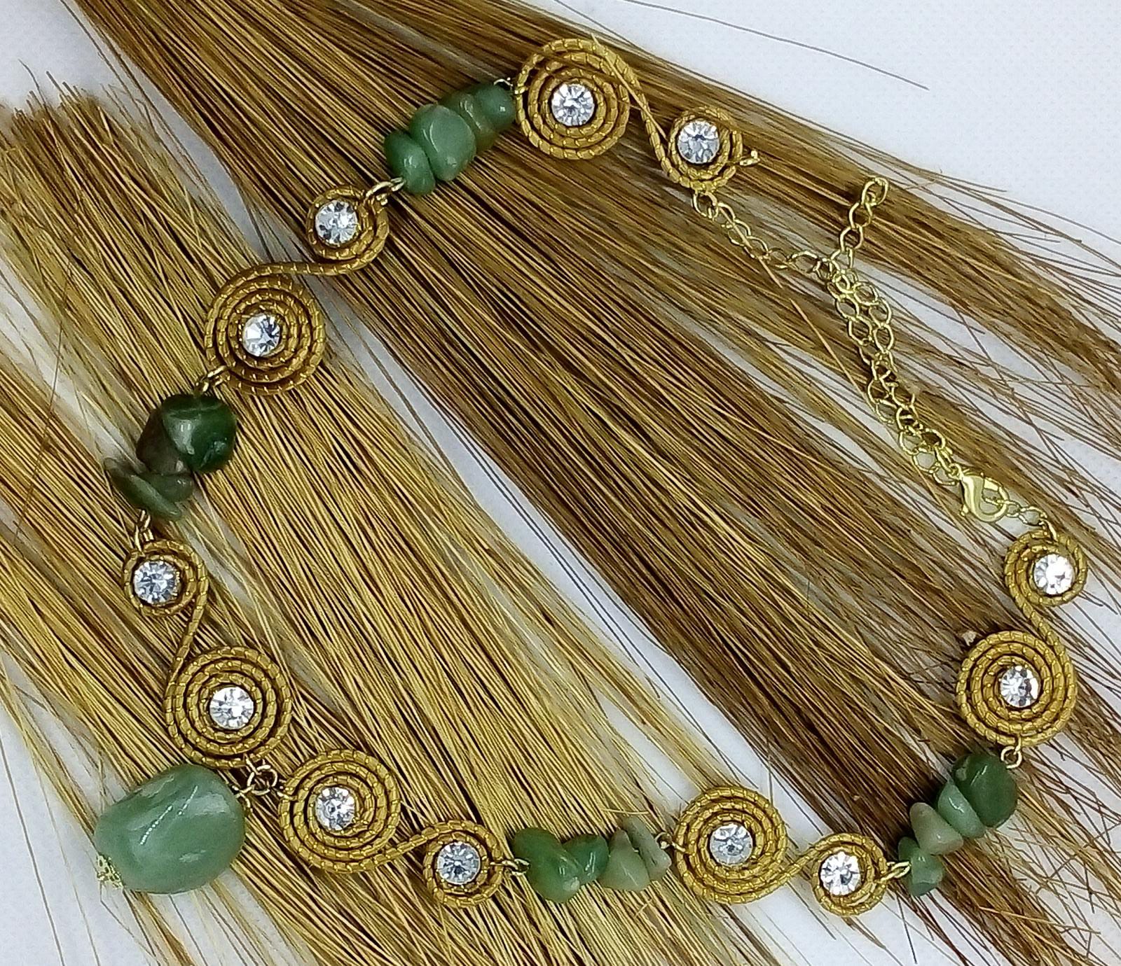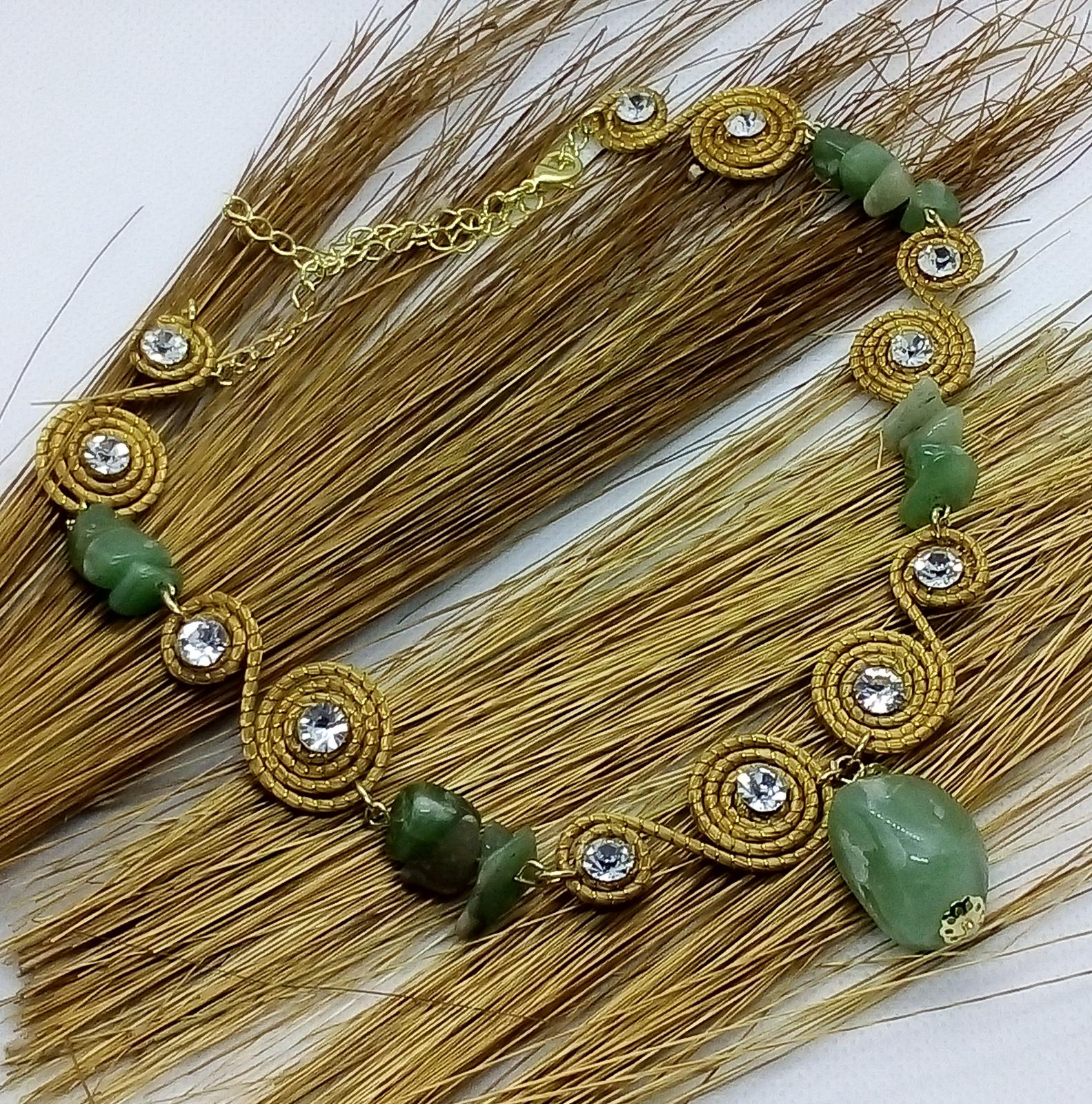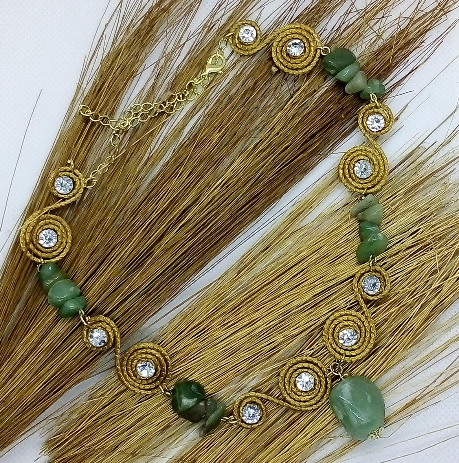 Collana in Capim Dourado spirale com strass trasparente e chips pietre avventurina, ciondolo sassi burattato di avventurina molto delicato e raffinato
