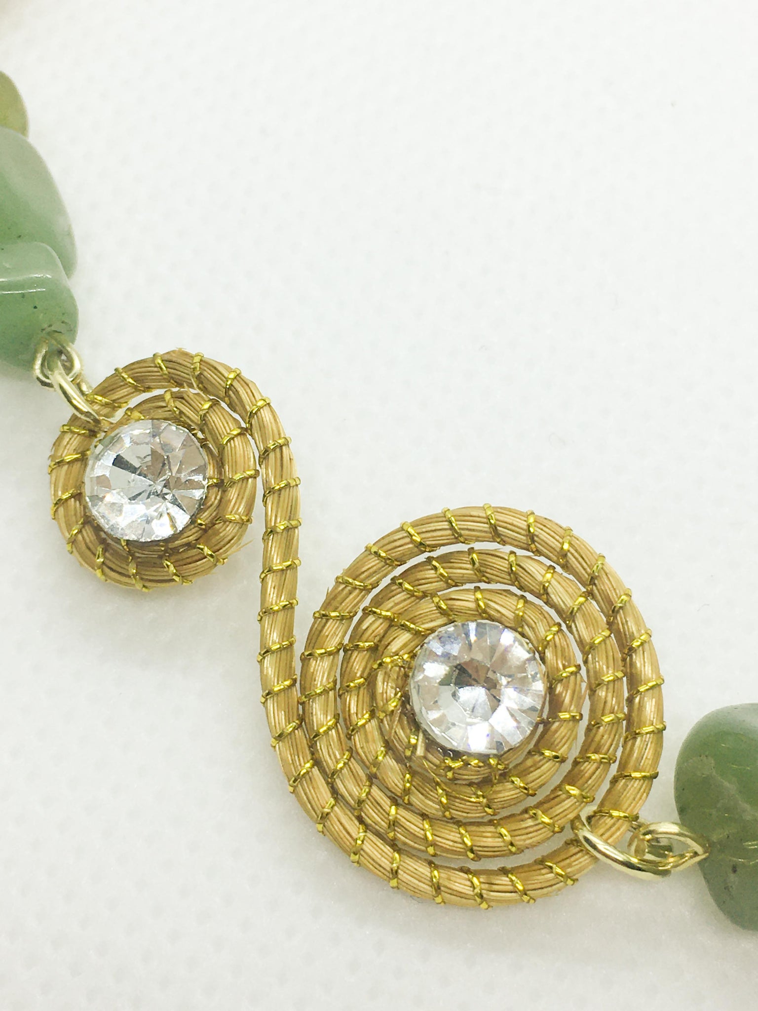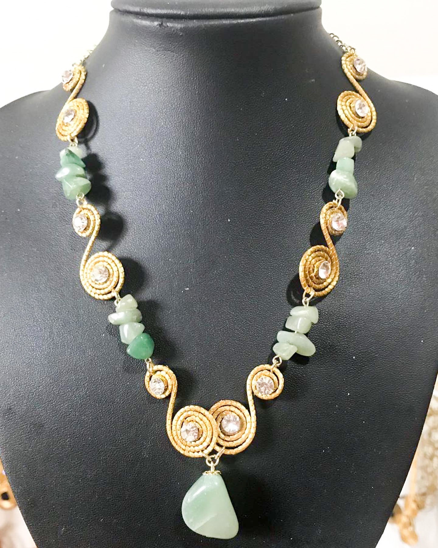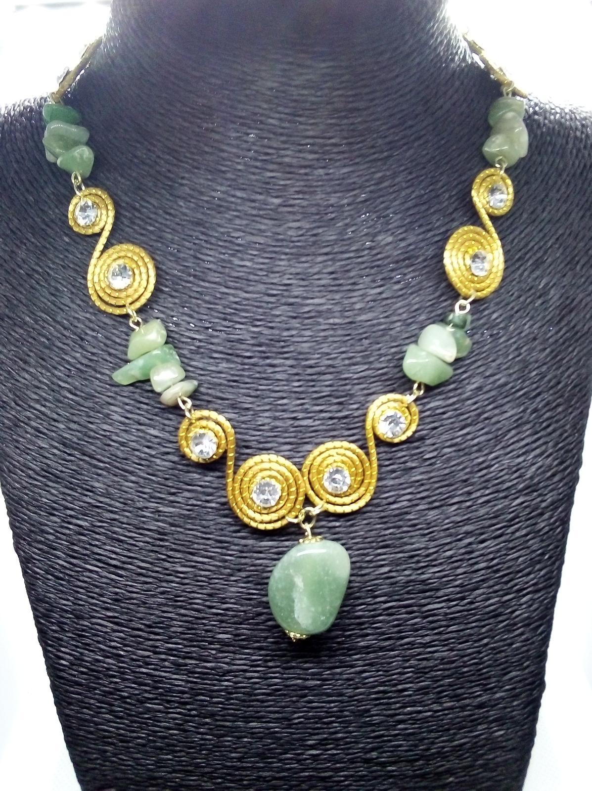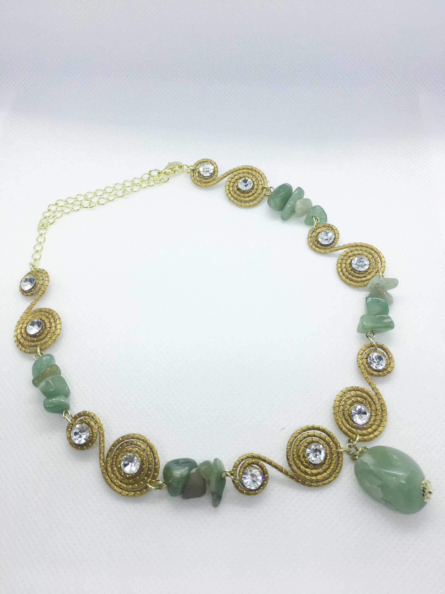 Collana in Capim Dourado spirale com strass trasparente e chips pietre avventurina, ciondolo sassi burattato di avventurina molto delicato e raffinato
