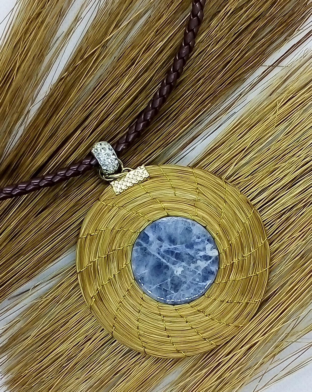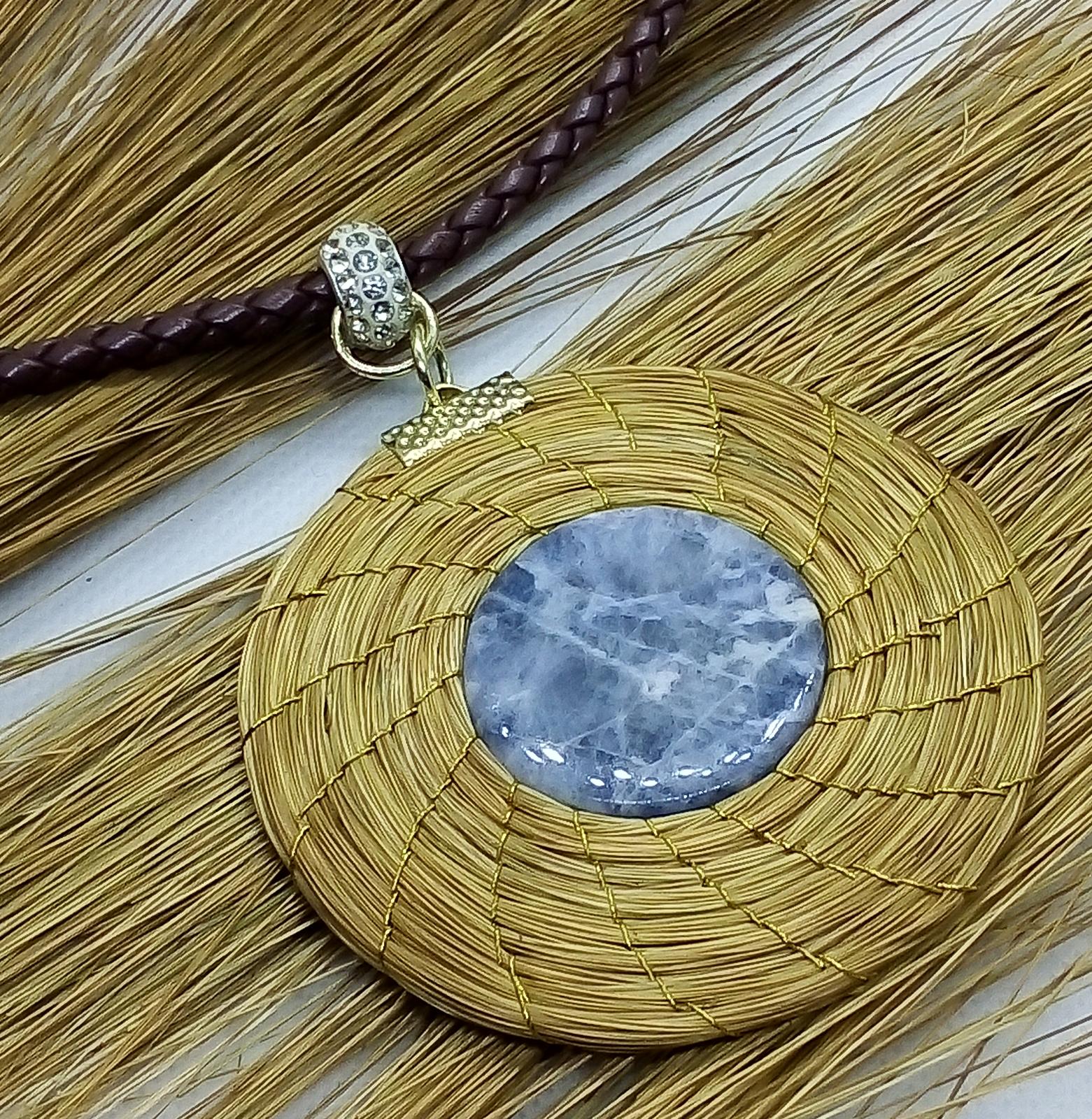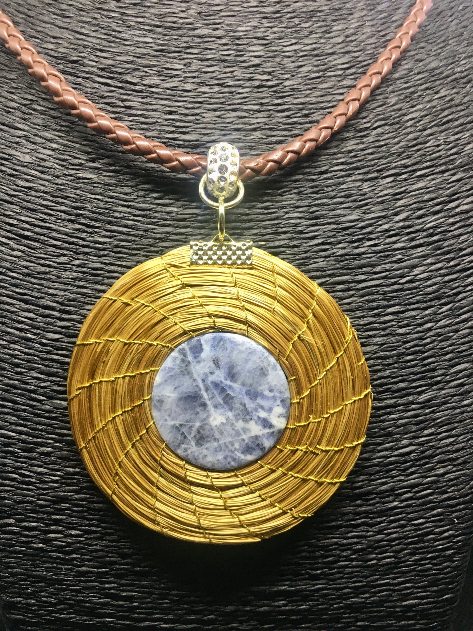 Collana in Pelle, ciondolo tondo in Capim Dourado con passante in strass trasparente e pietra dura piatta liscia e tonda al centro