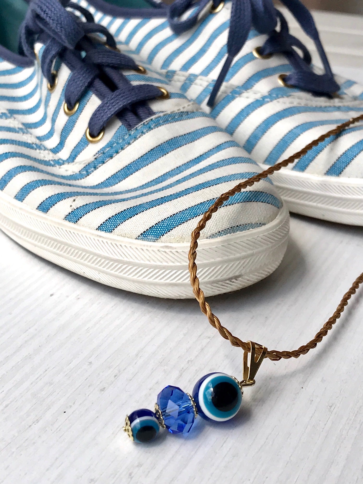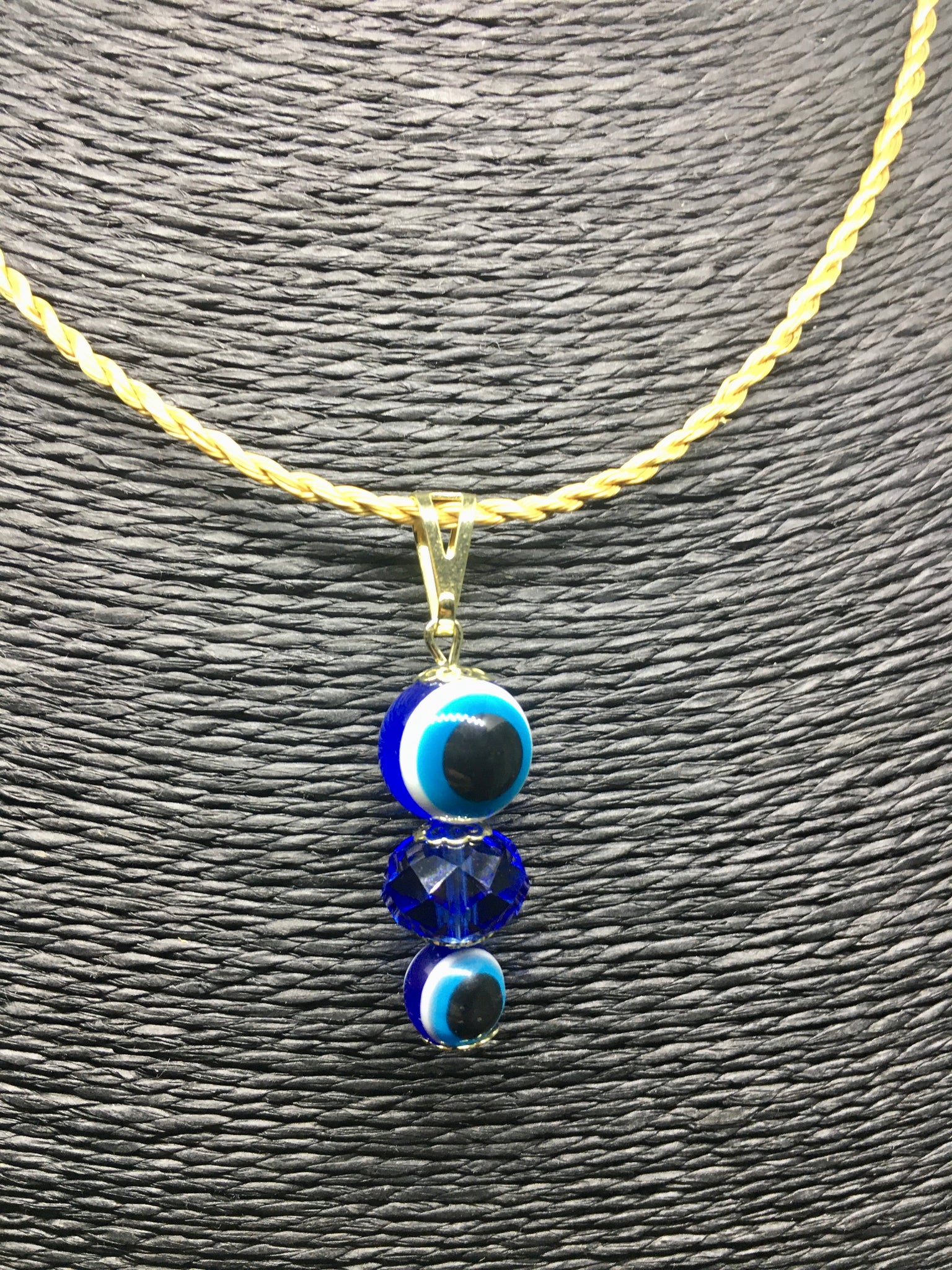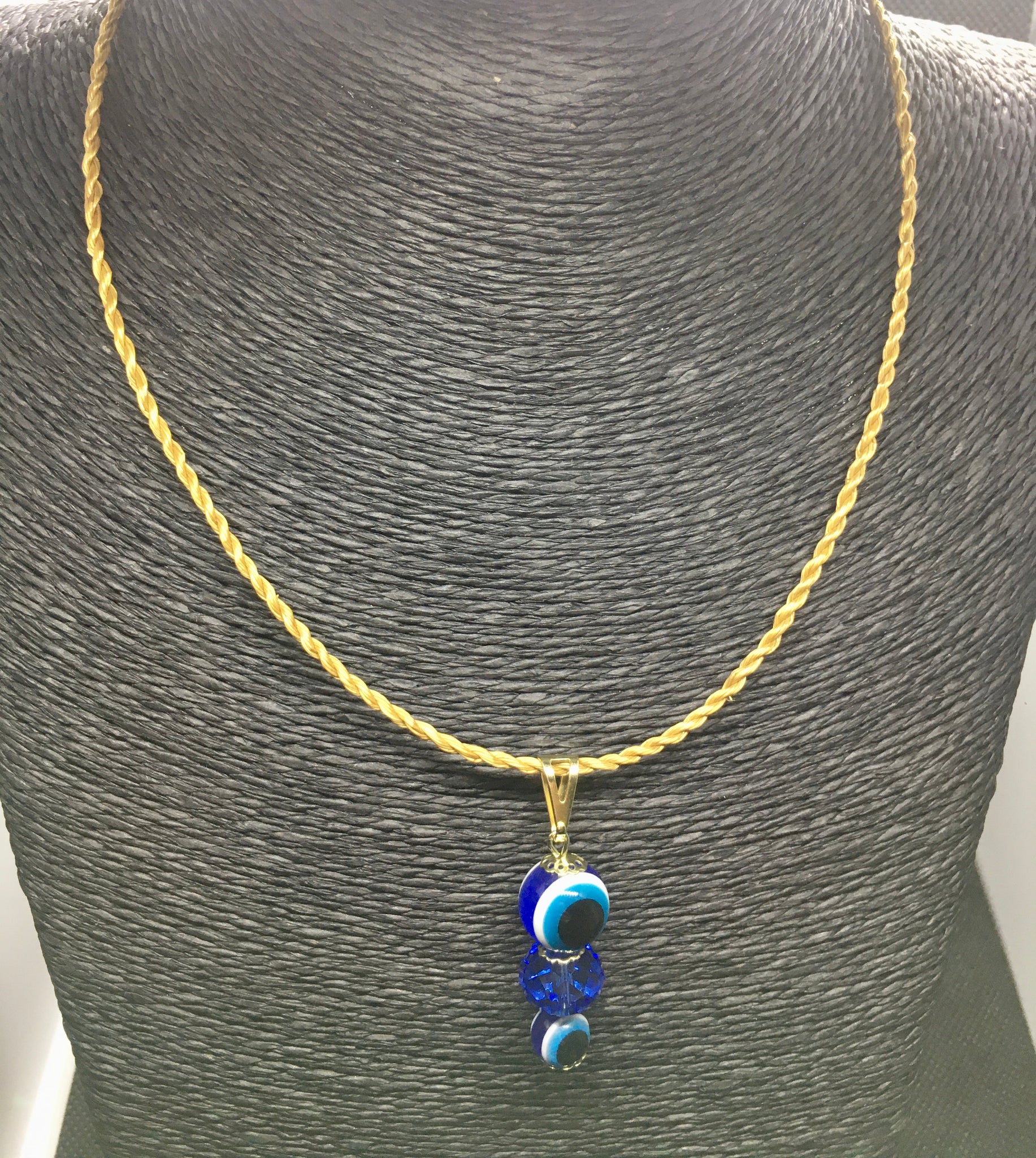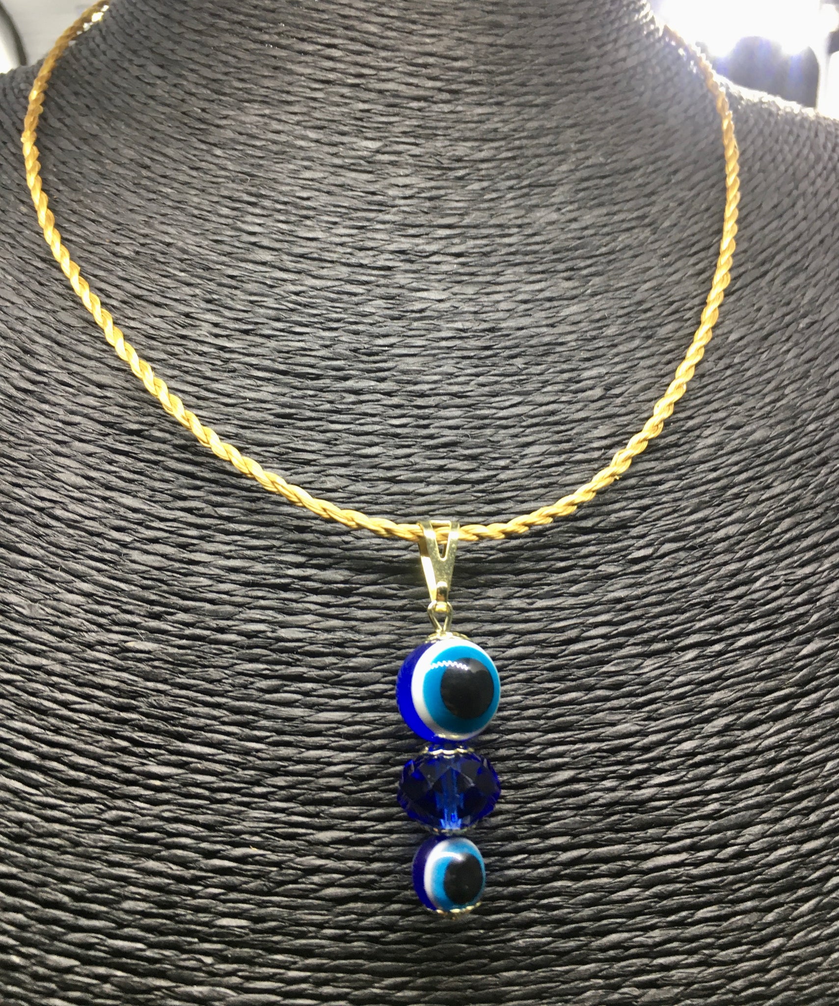 Collanina delicata in Capim Dourado con ciondolo doppio occhio greco e perlina in vetro azzurro