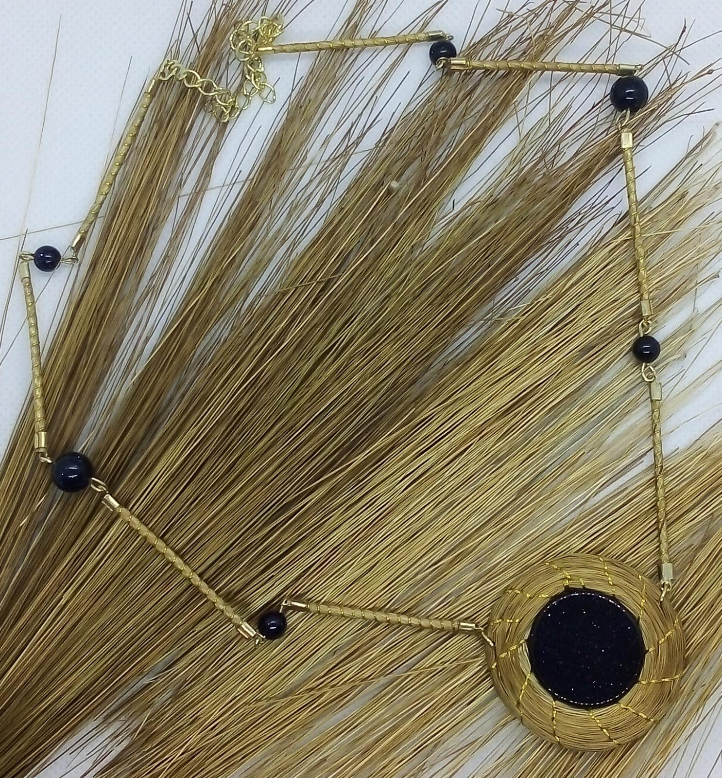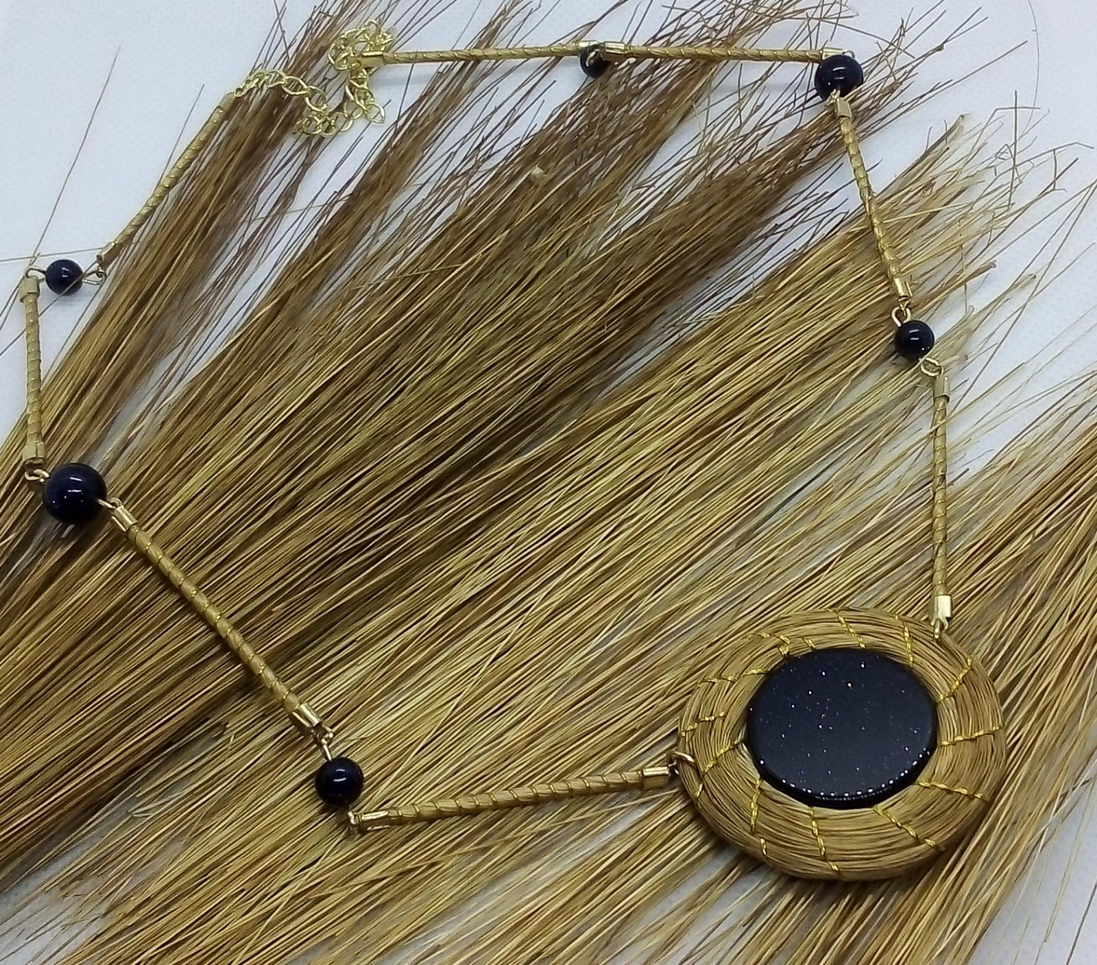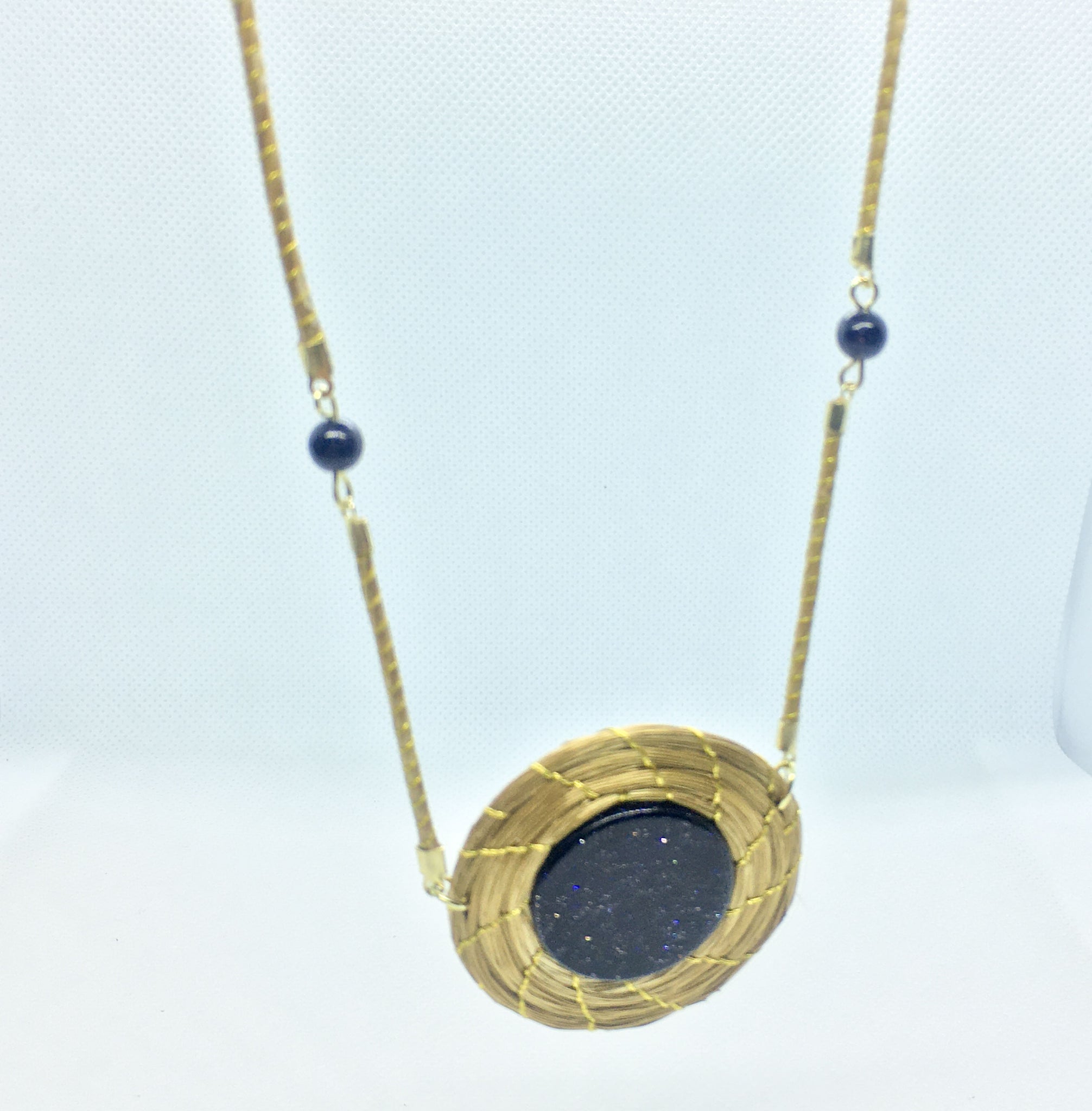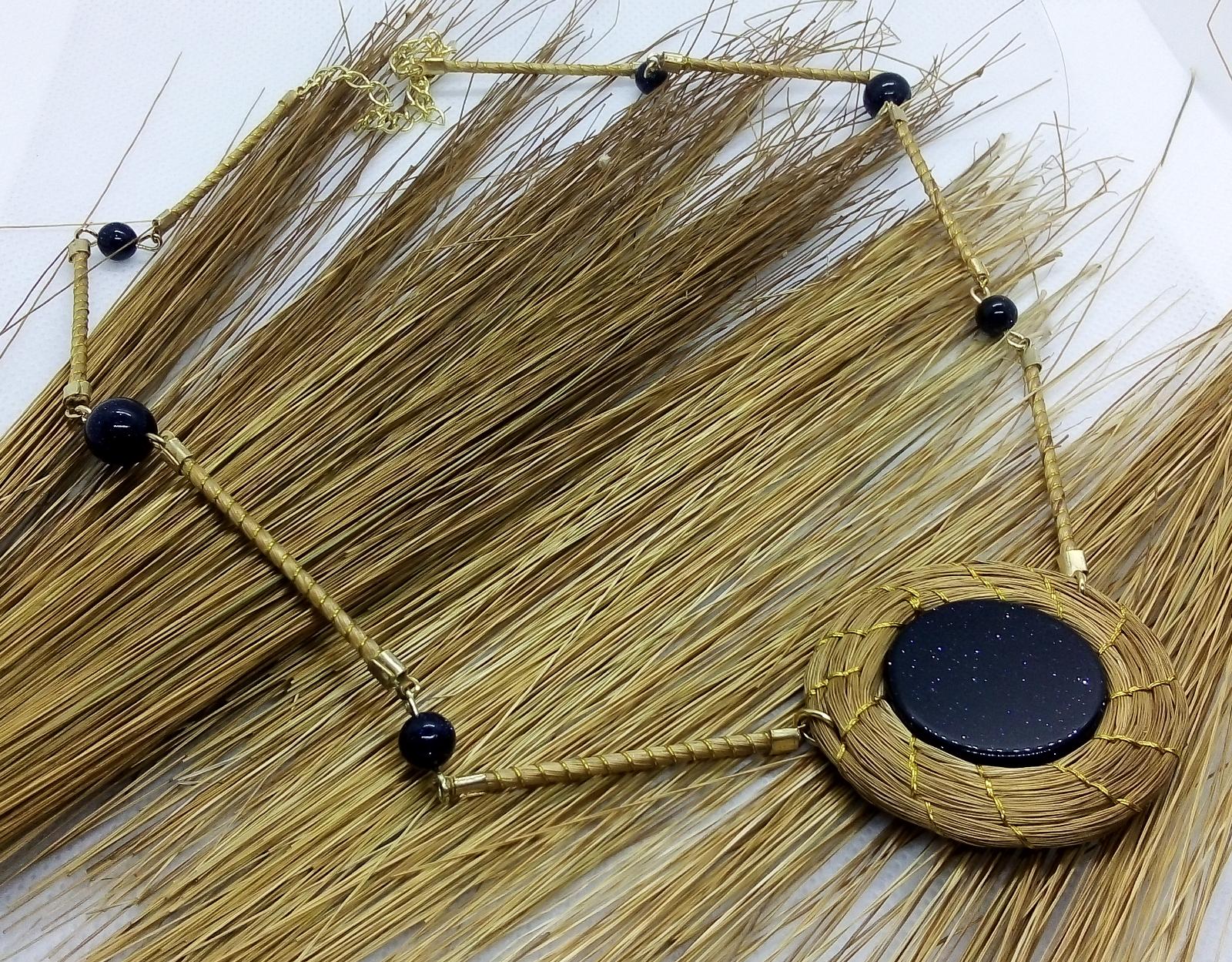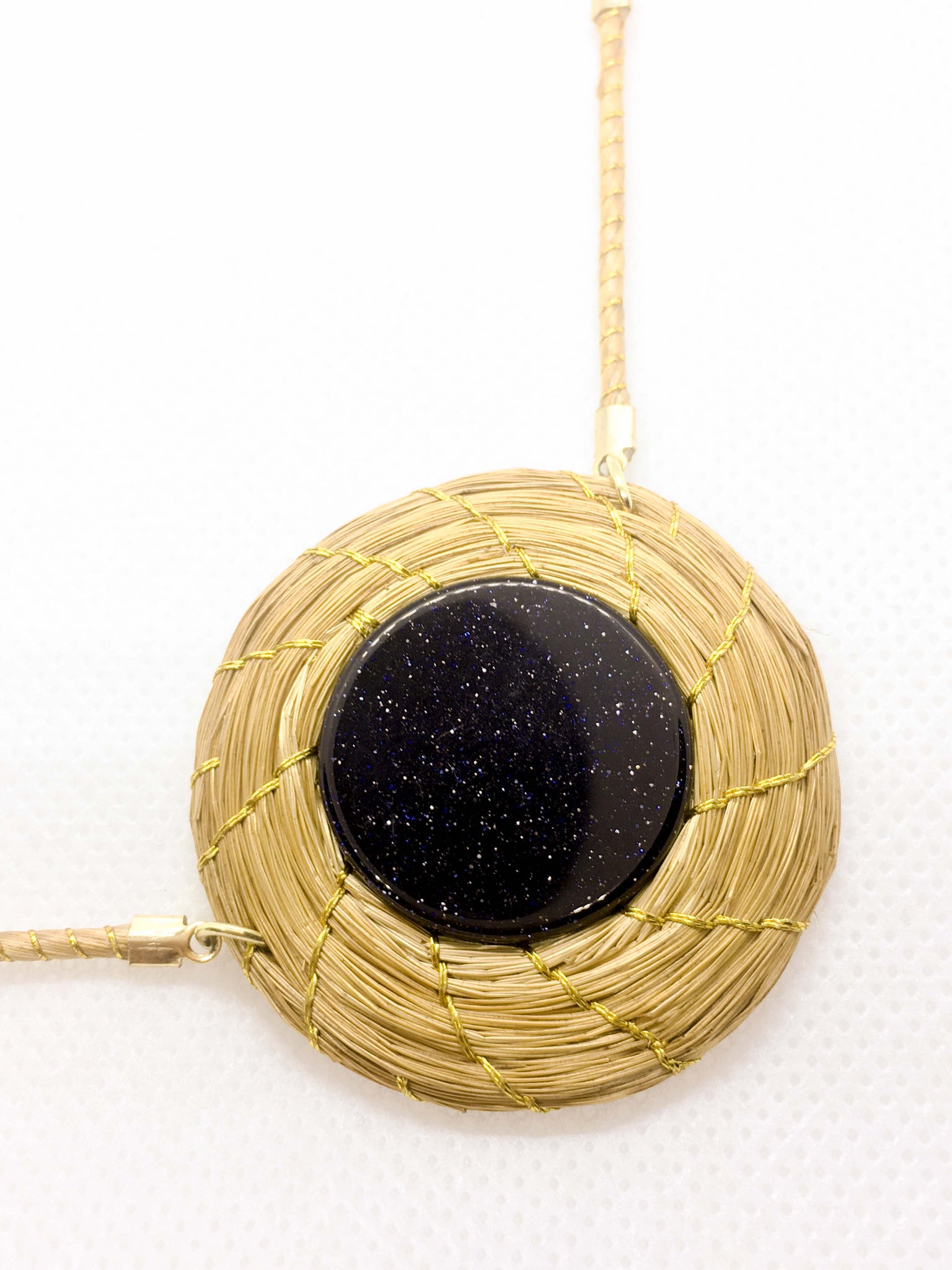 Collana in Capim Dourado, ciondolo a cerchio capim dourado e pietra del sole blu tondo liscio piatto al centro.