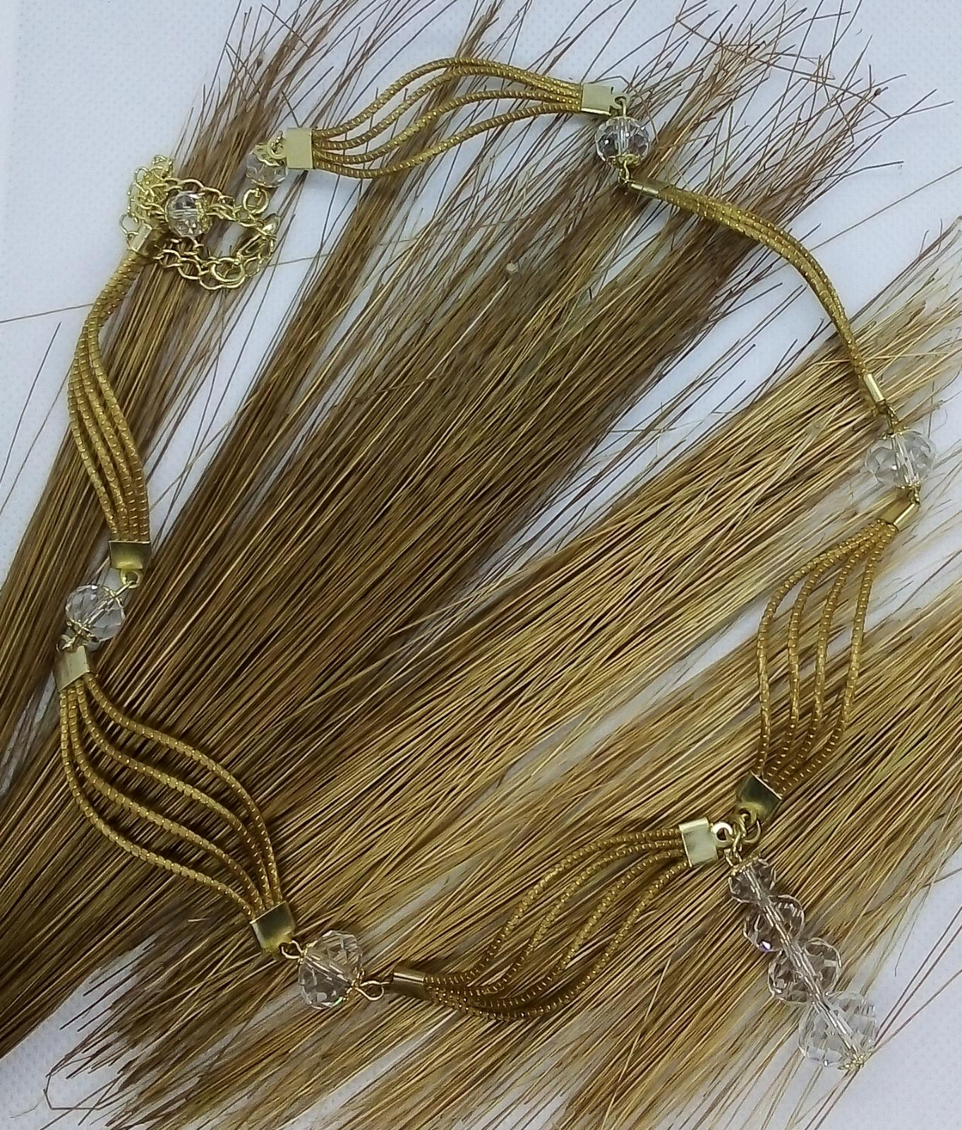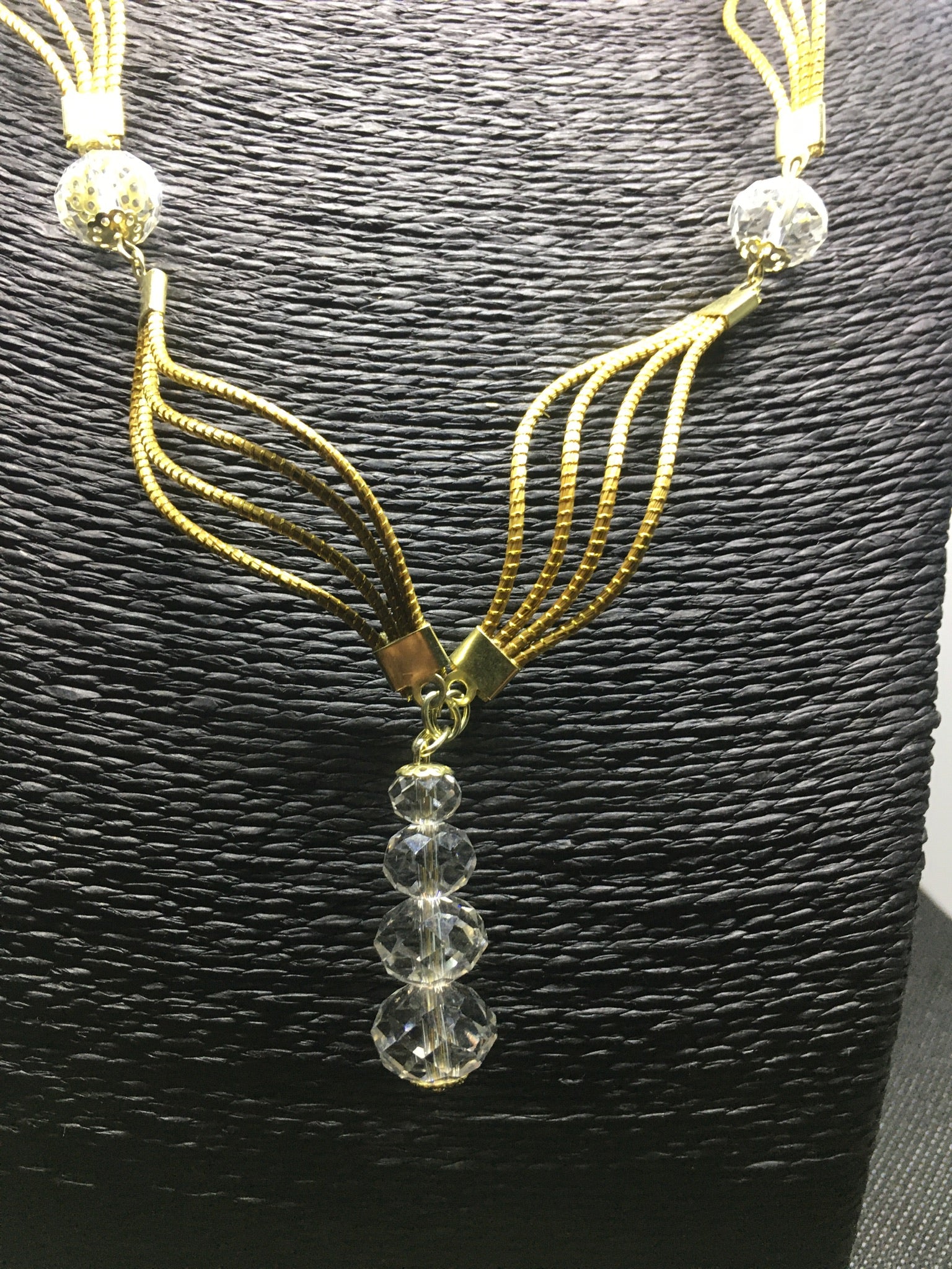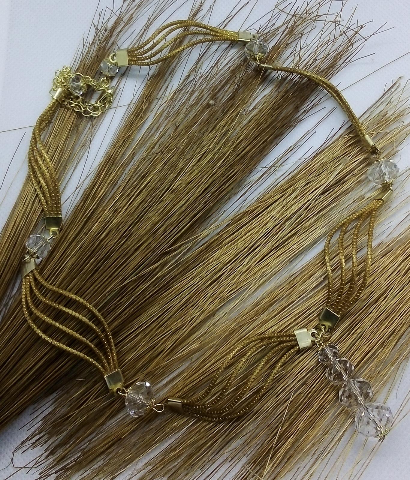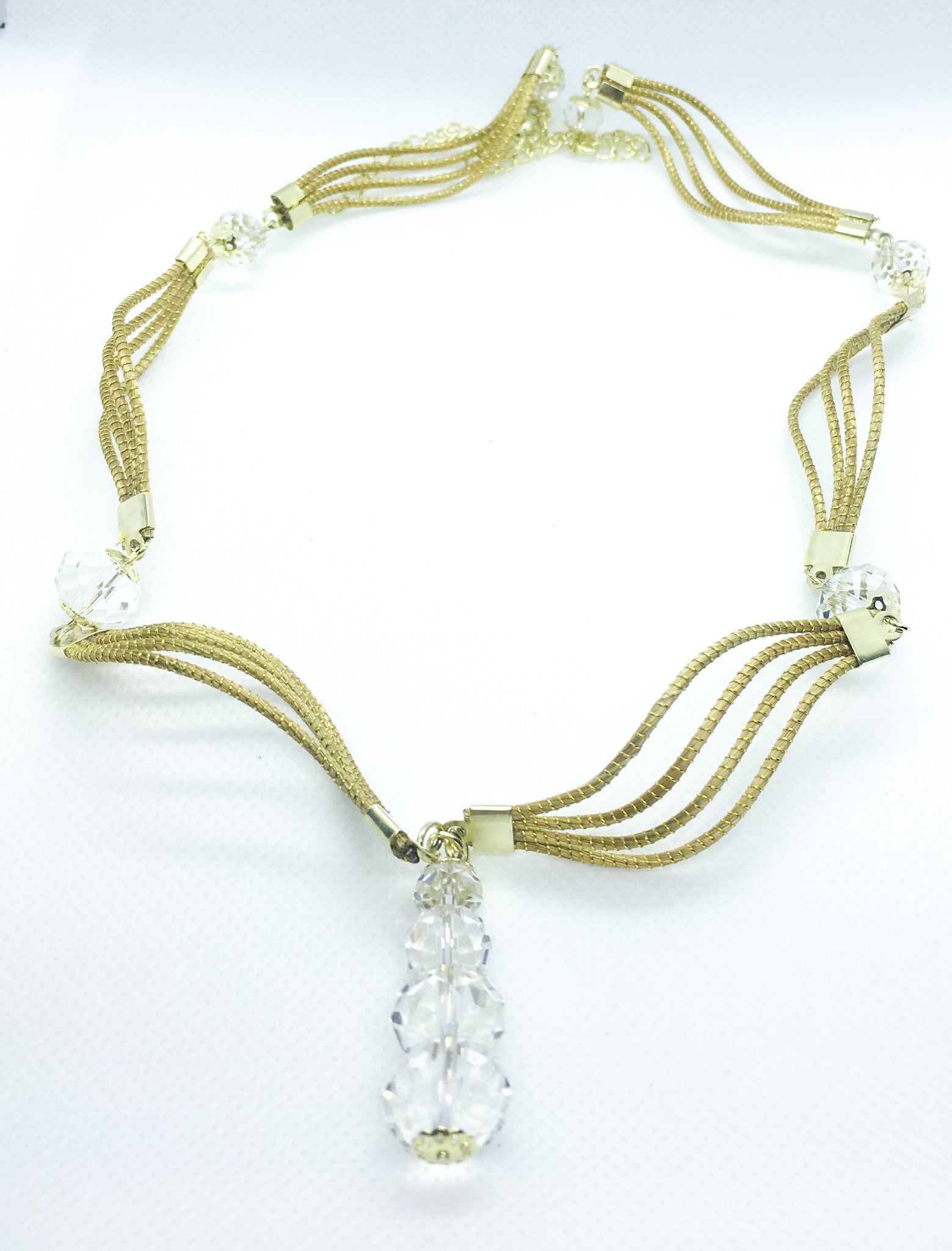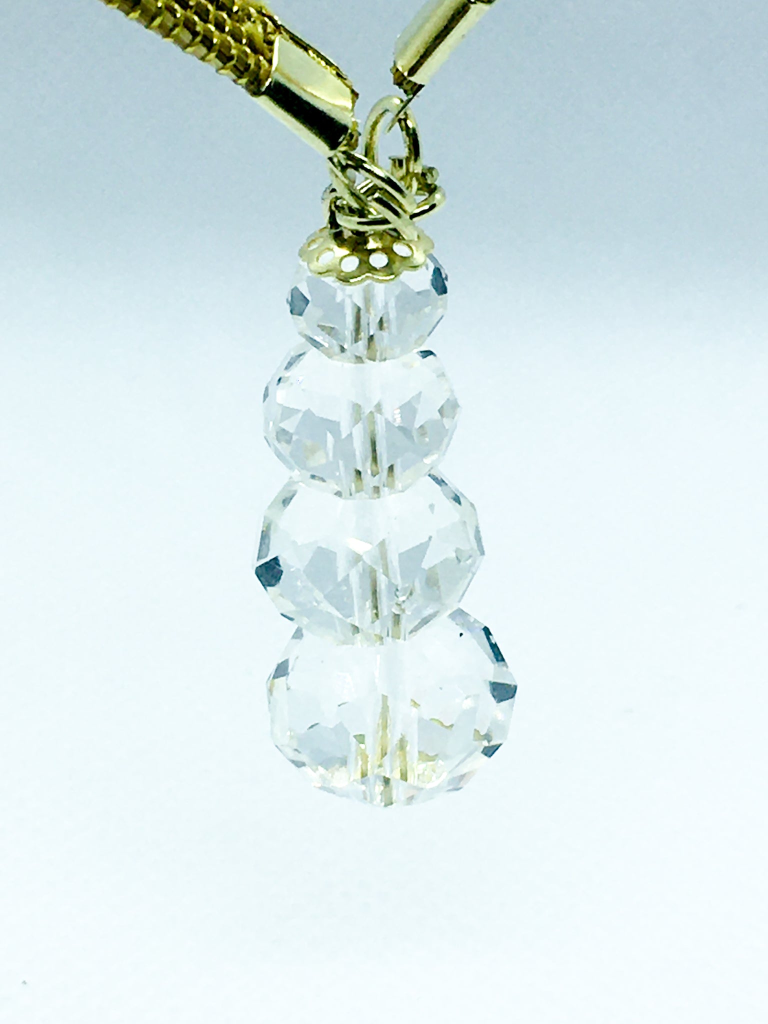 Collana Capim Dourado a forma ellittica con perline di vetro sfaccettate trasparente, ciondolo con quattro perline di vetro trasparente di diverse misure.