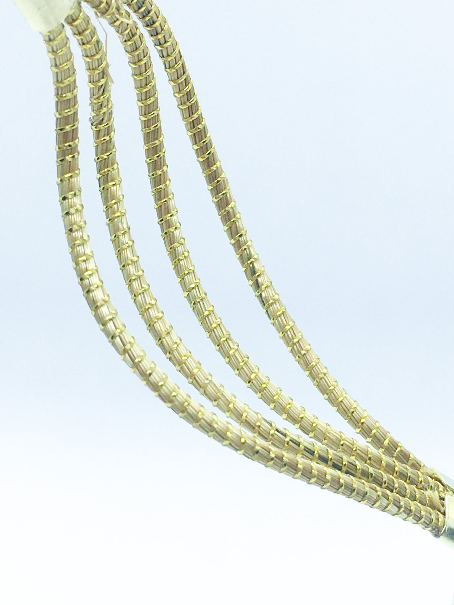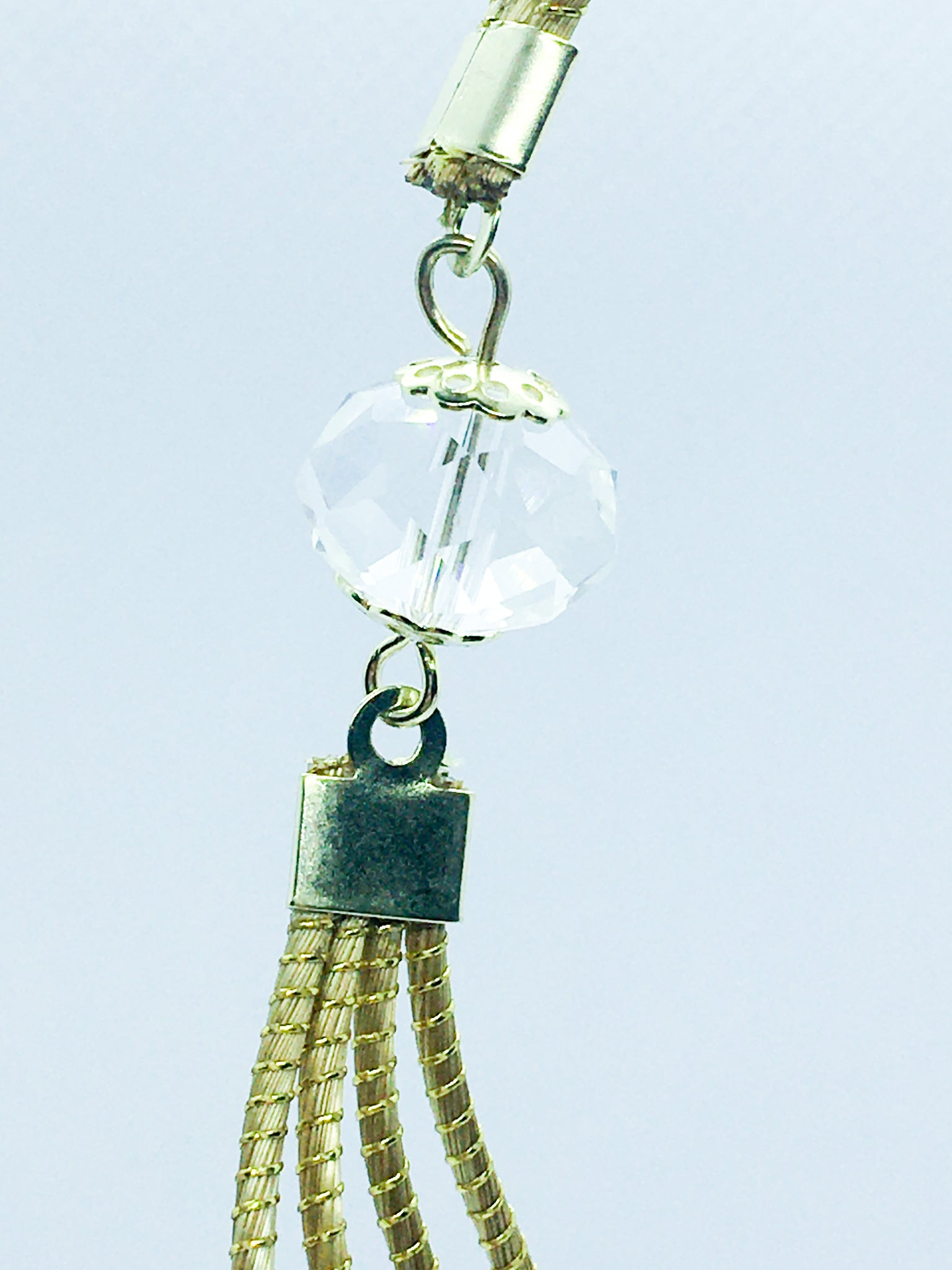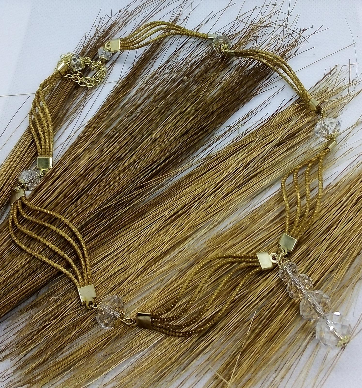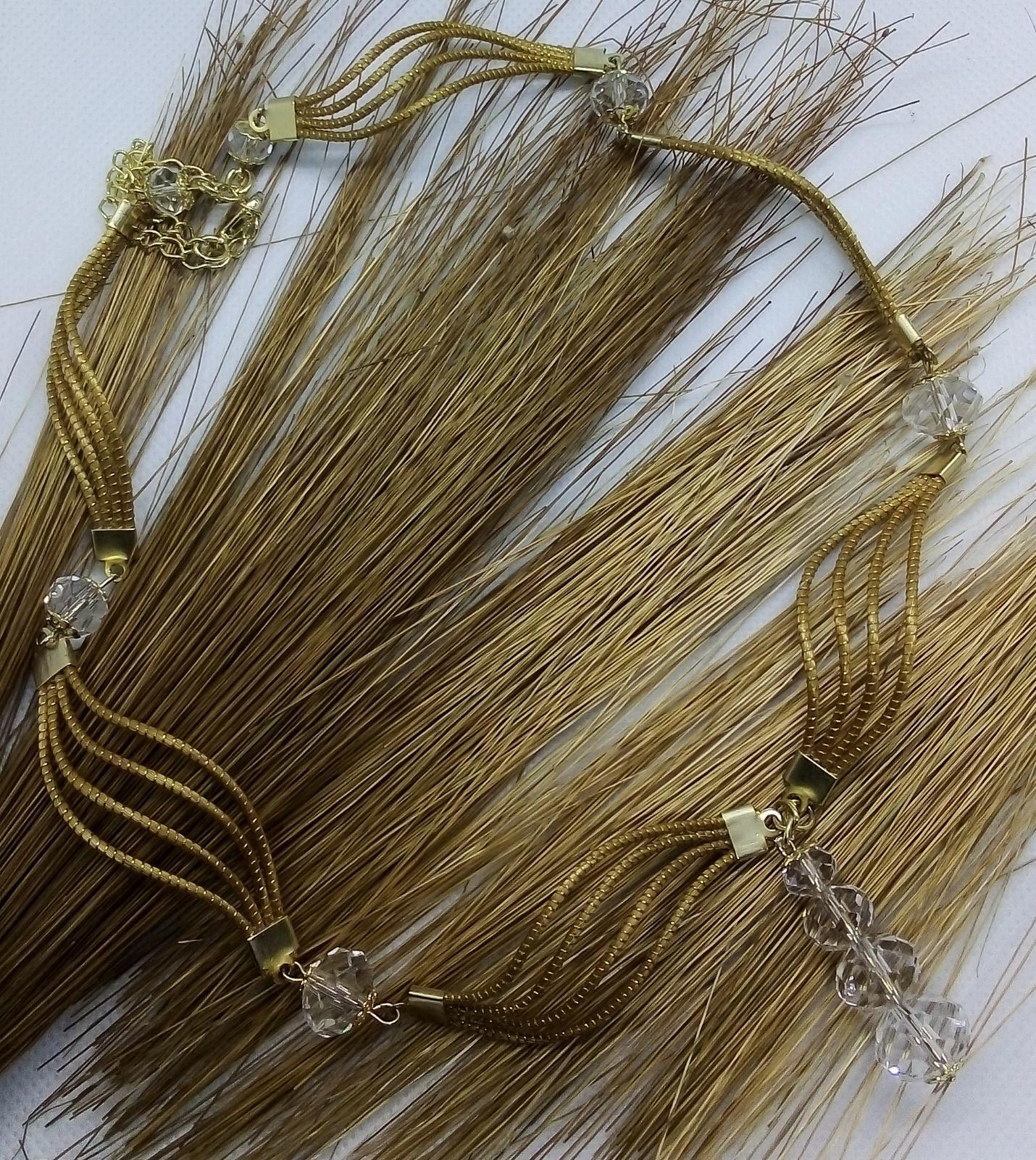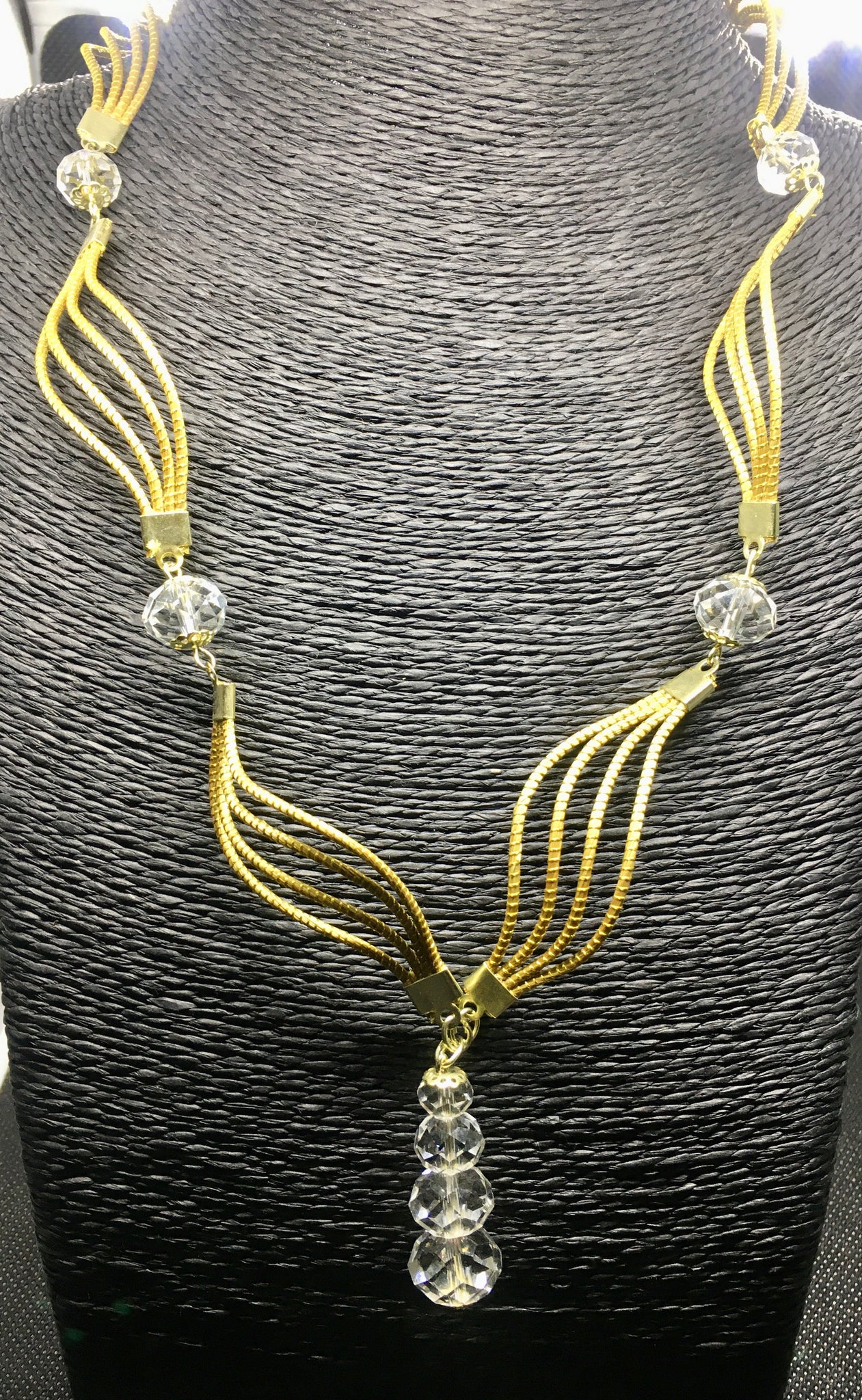 Collana Capim Dourado a forma ellittica con perline di vetro sfaccettate trasparente, ciondolo con quattro perline di vetro trasparente di diverse misure.
