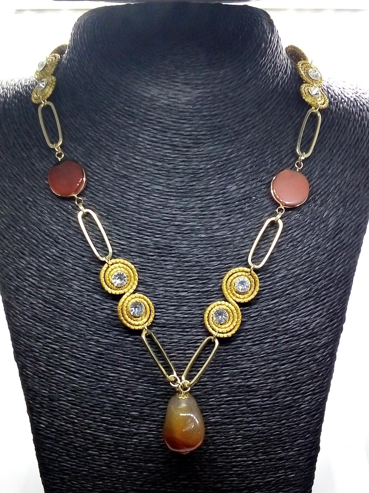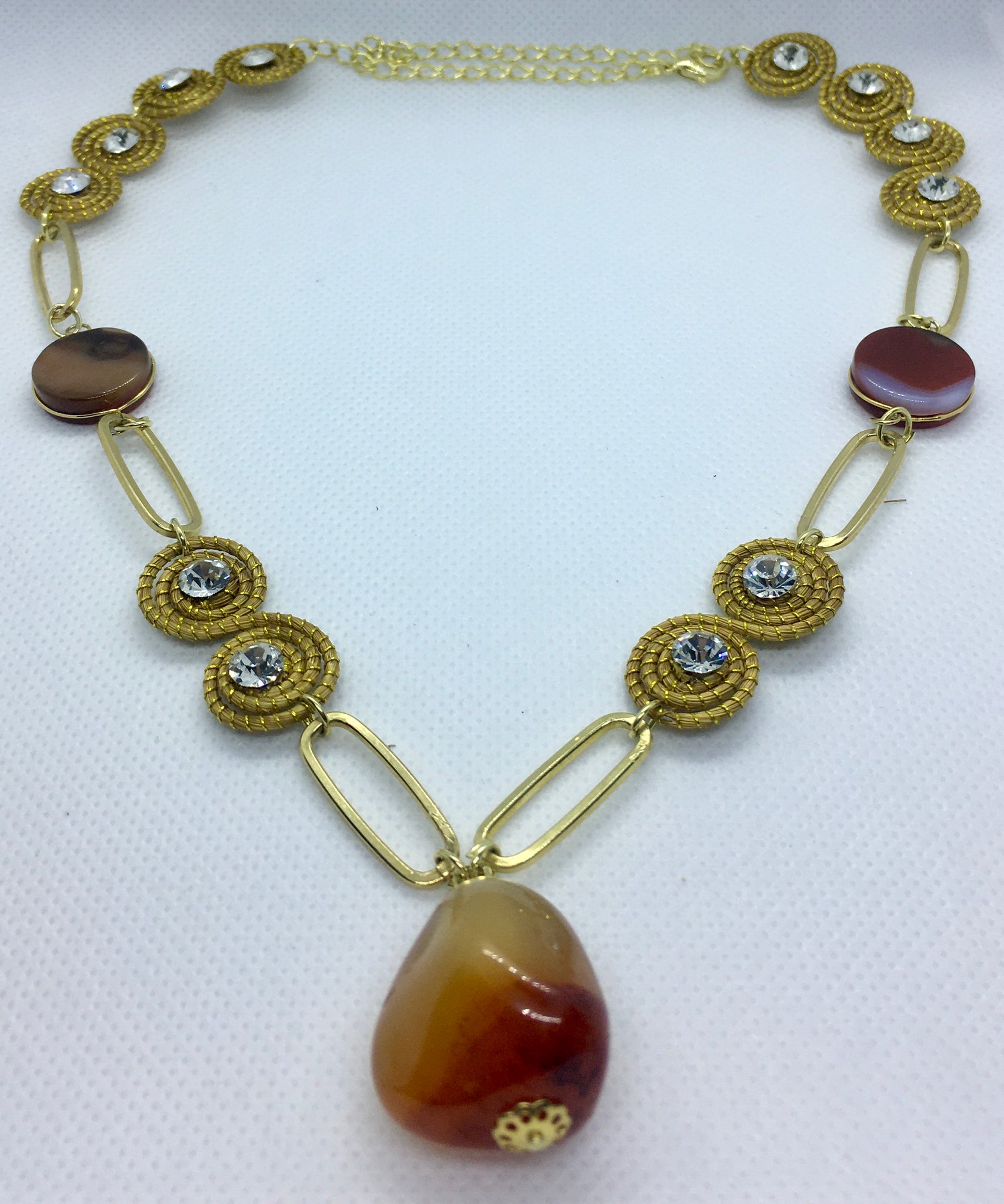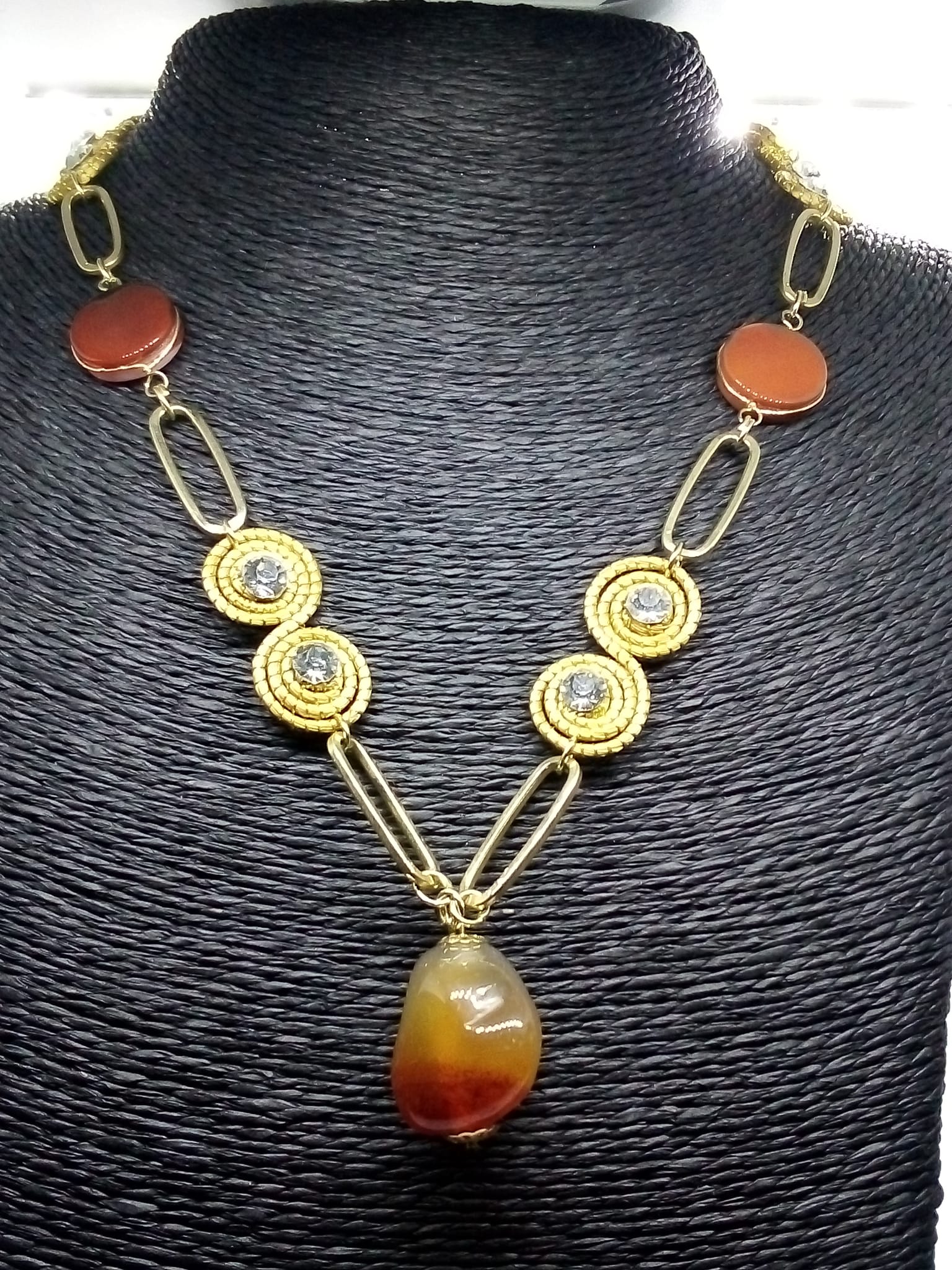 Collana con Piccoli Spirali in Capim Dourado con strass bianco ed Agata Fuoco piatta liscia tonda, ciondolo sasso di Agata Fuoco.