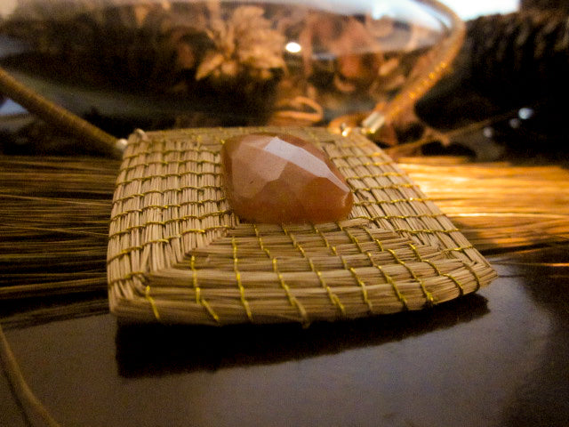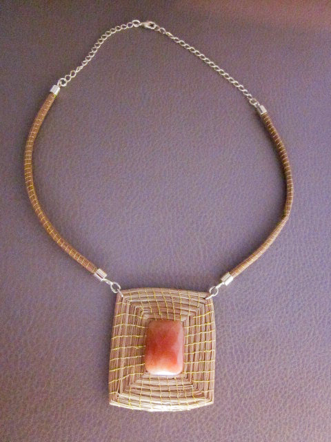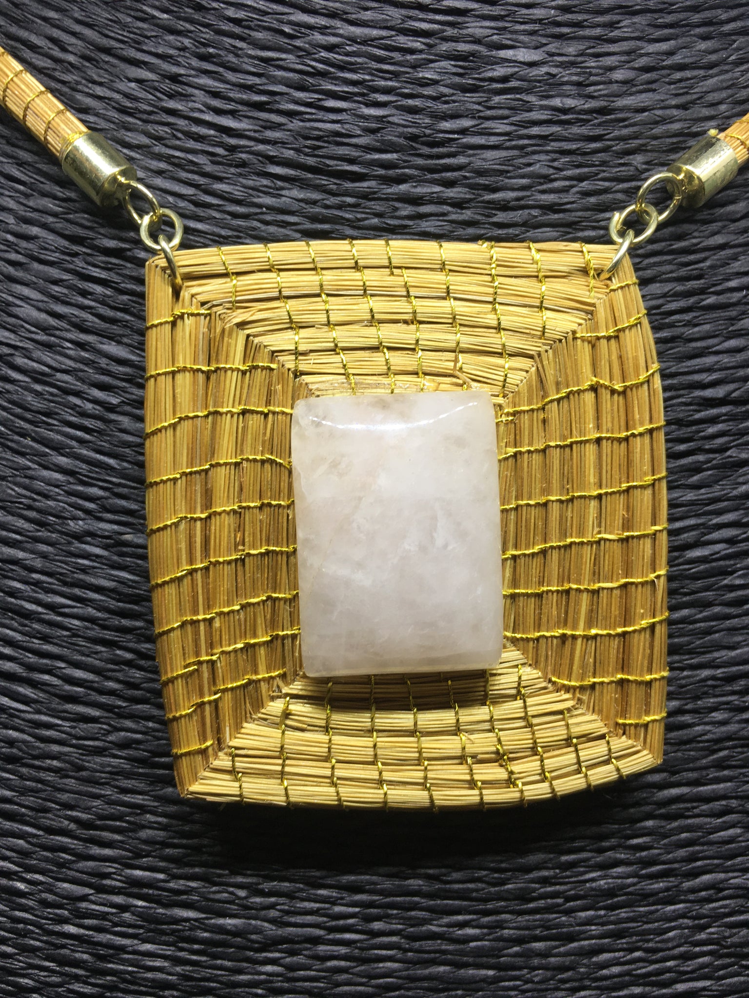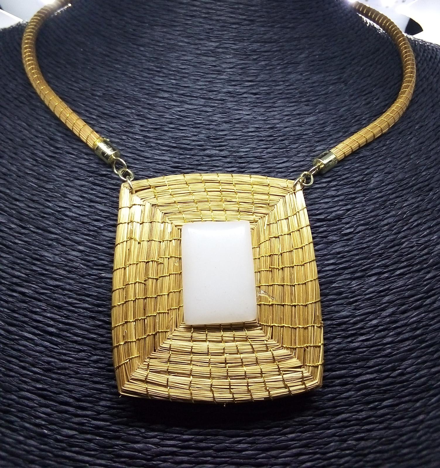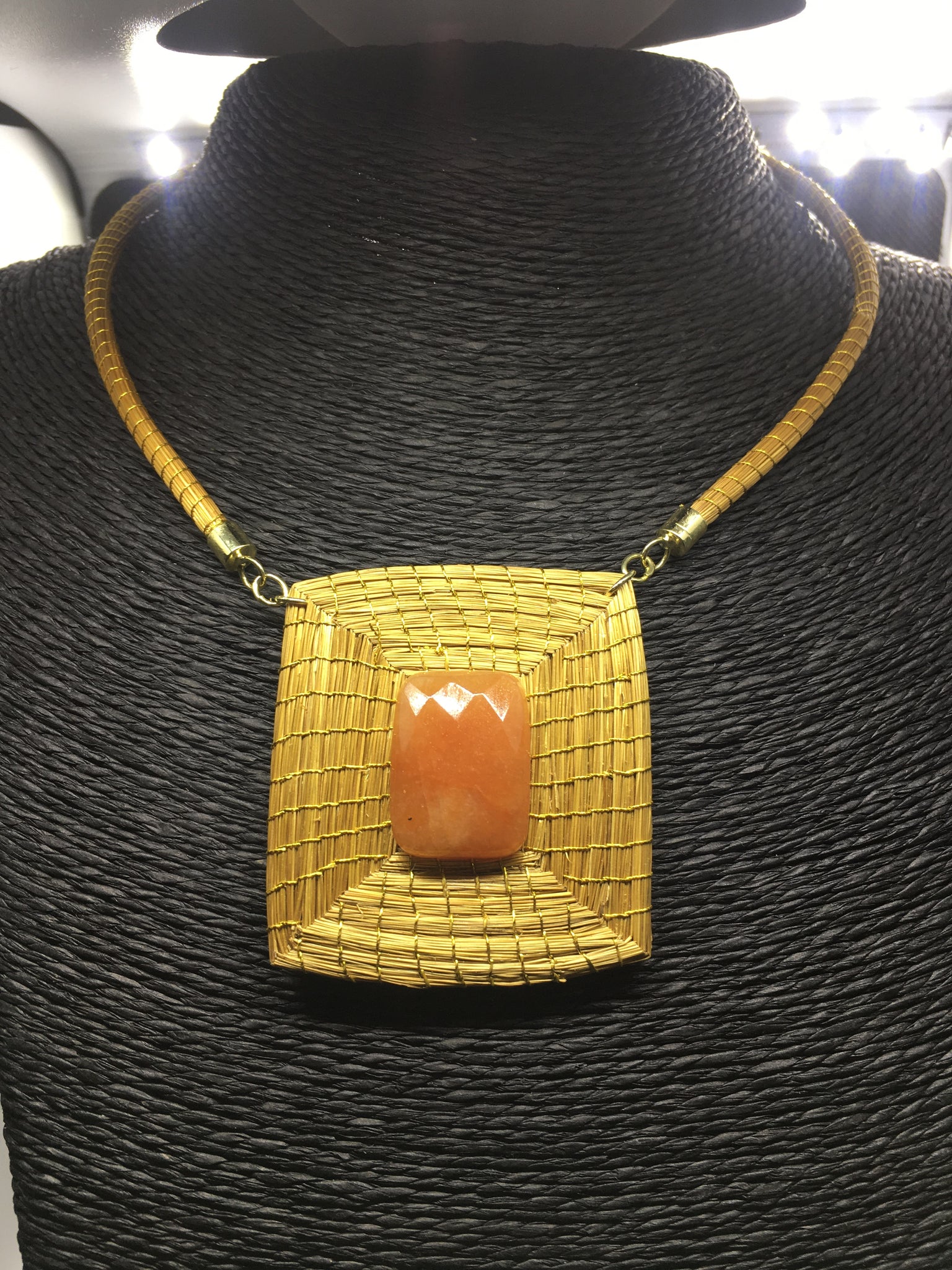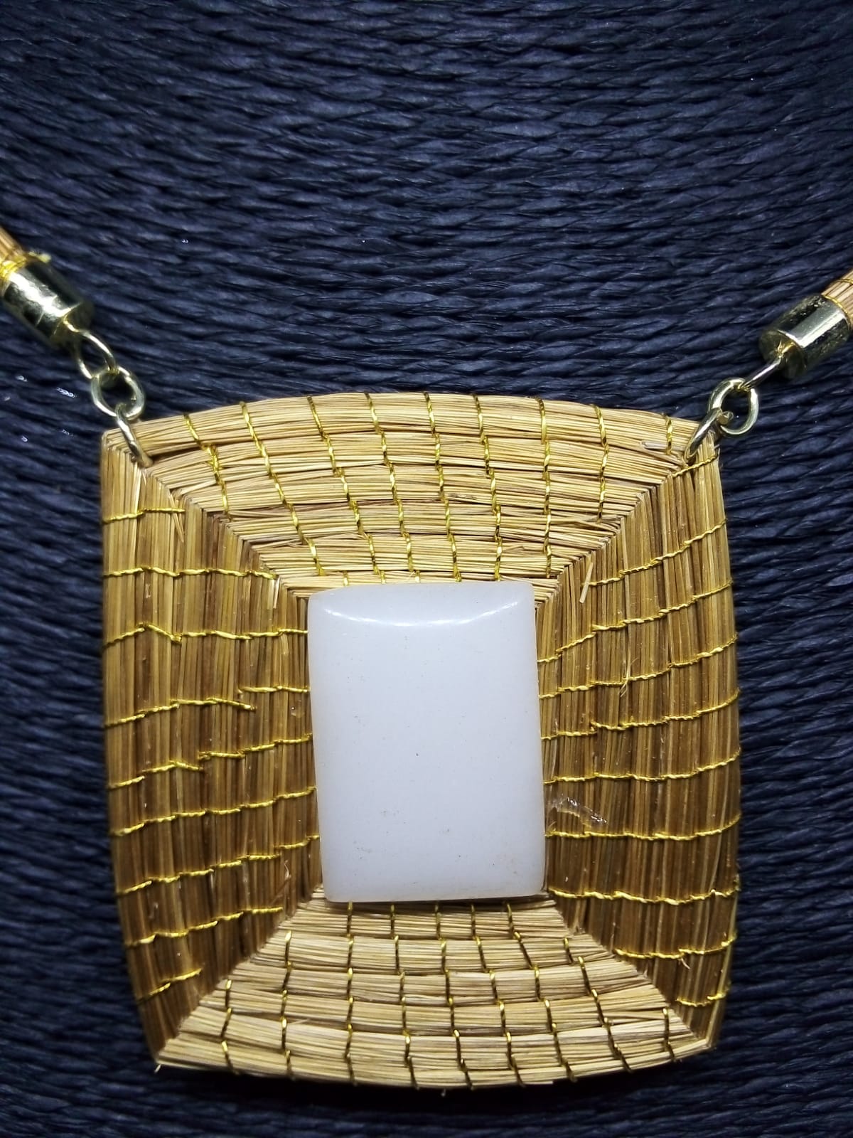 Collana girocollo Rigido in due pezzi in Capim Dourado, ciondolo quadrato in capim dourado con pietre dure al centro