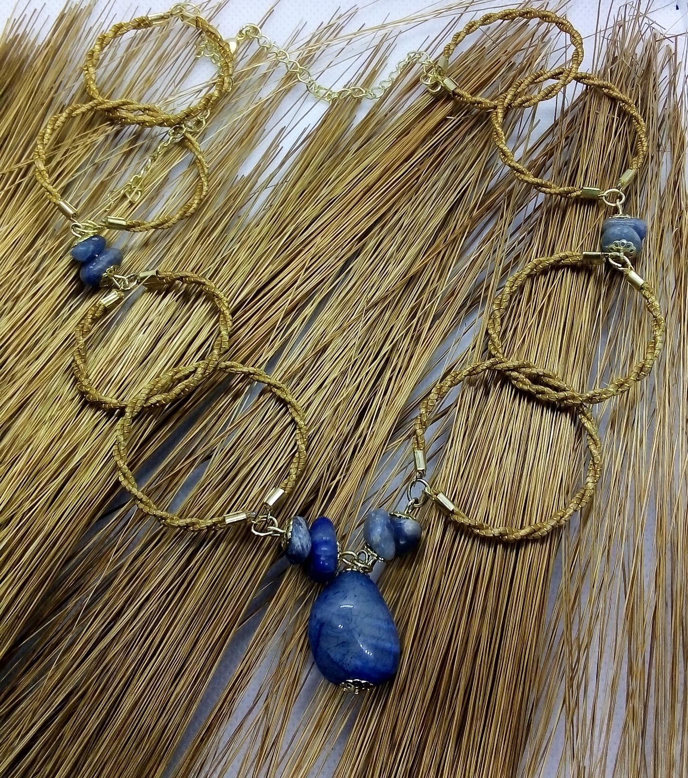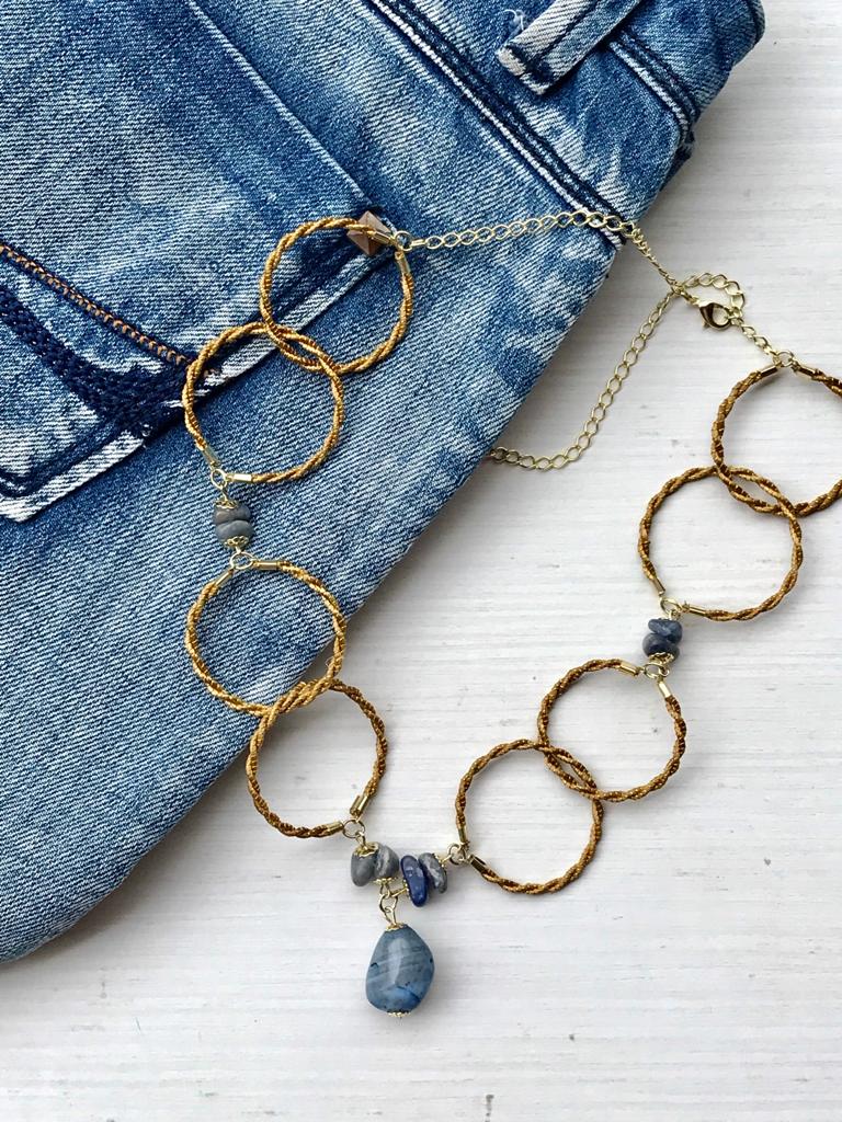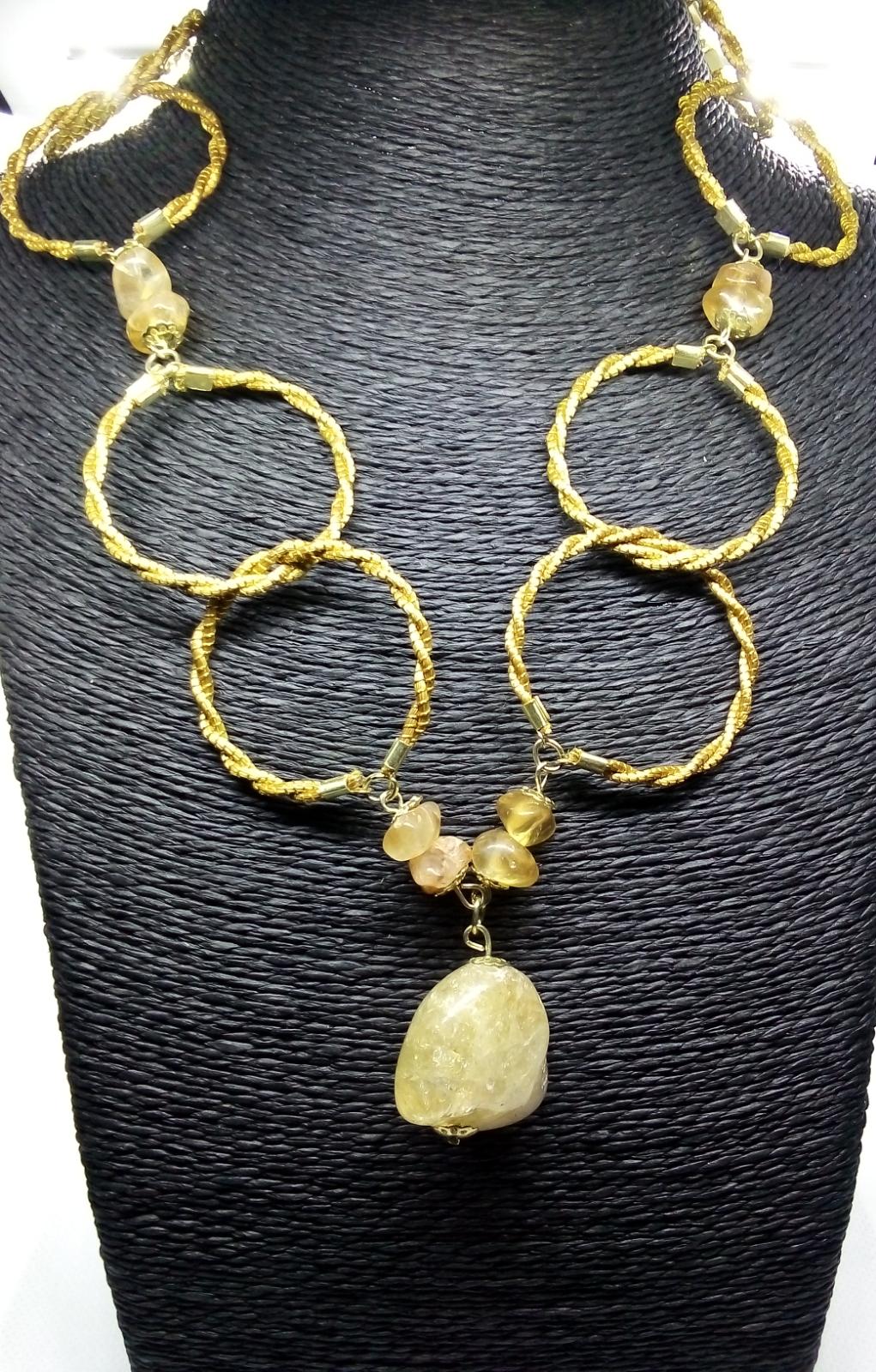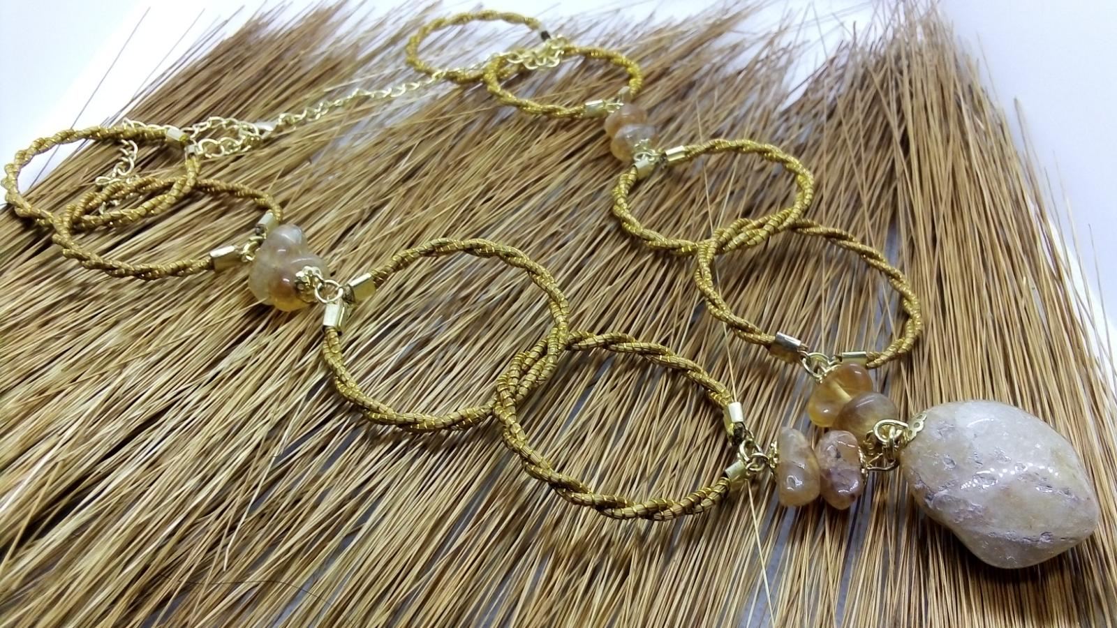 Collana con multiplici cerchi concatenati in Capim Dourado con chips di pietre dure lisce, ciondolo chips di pietre dure e sasso pietre dure lisce