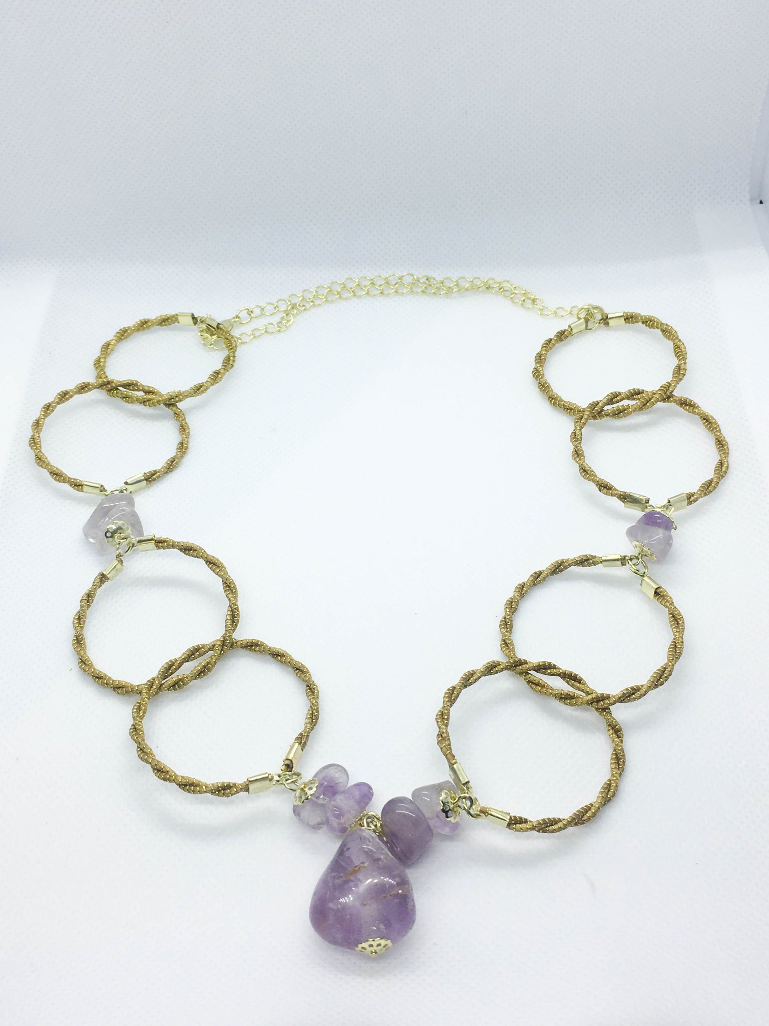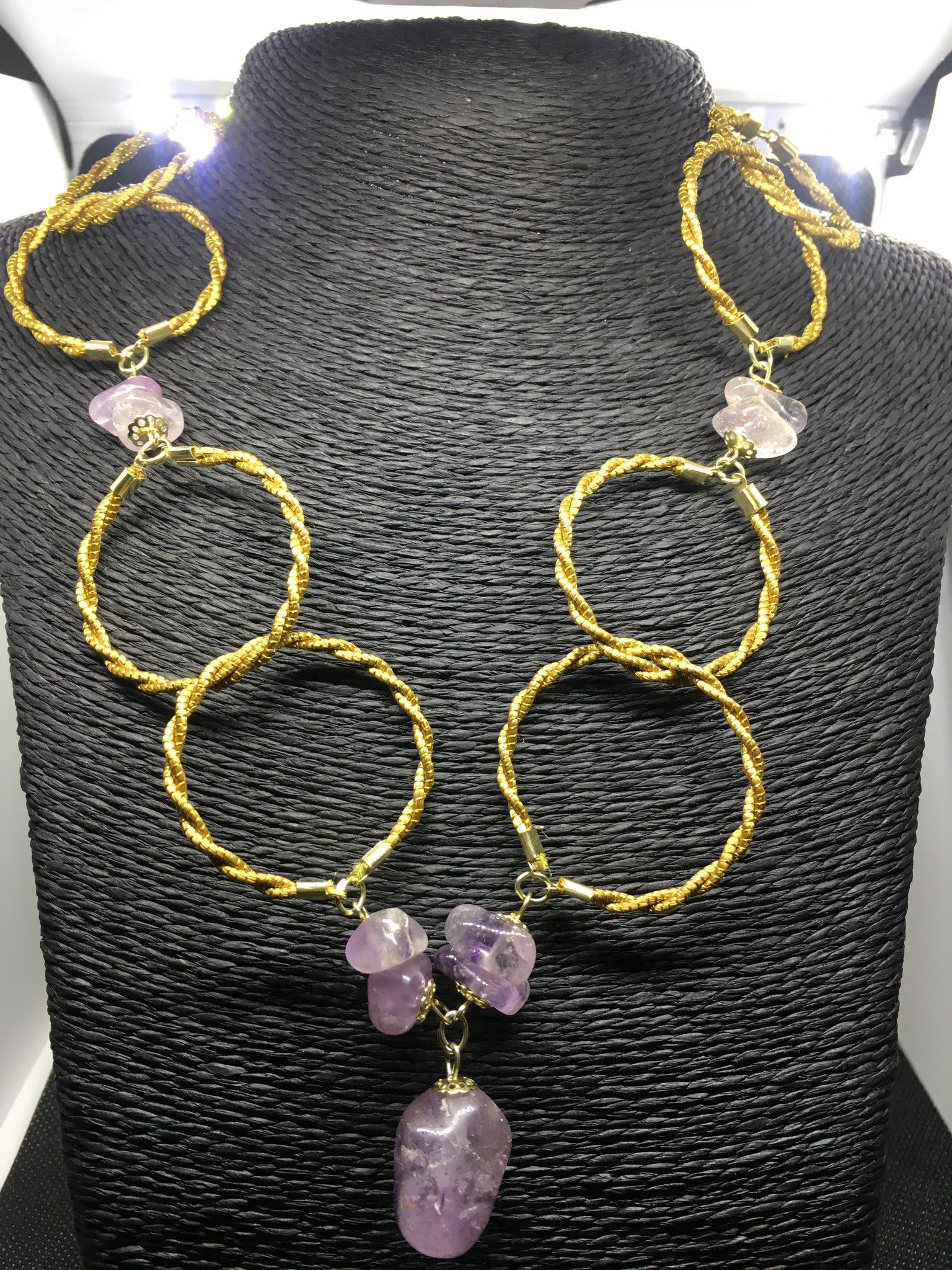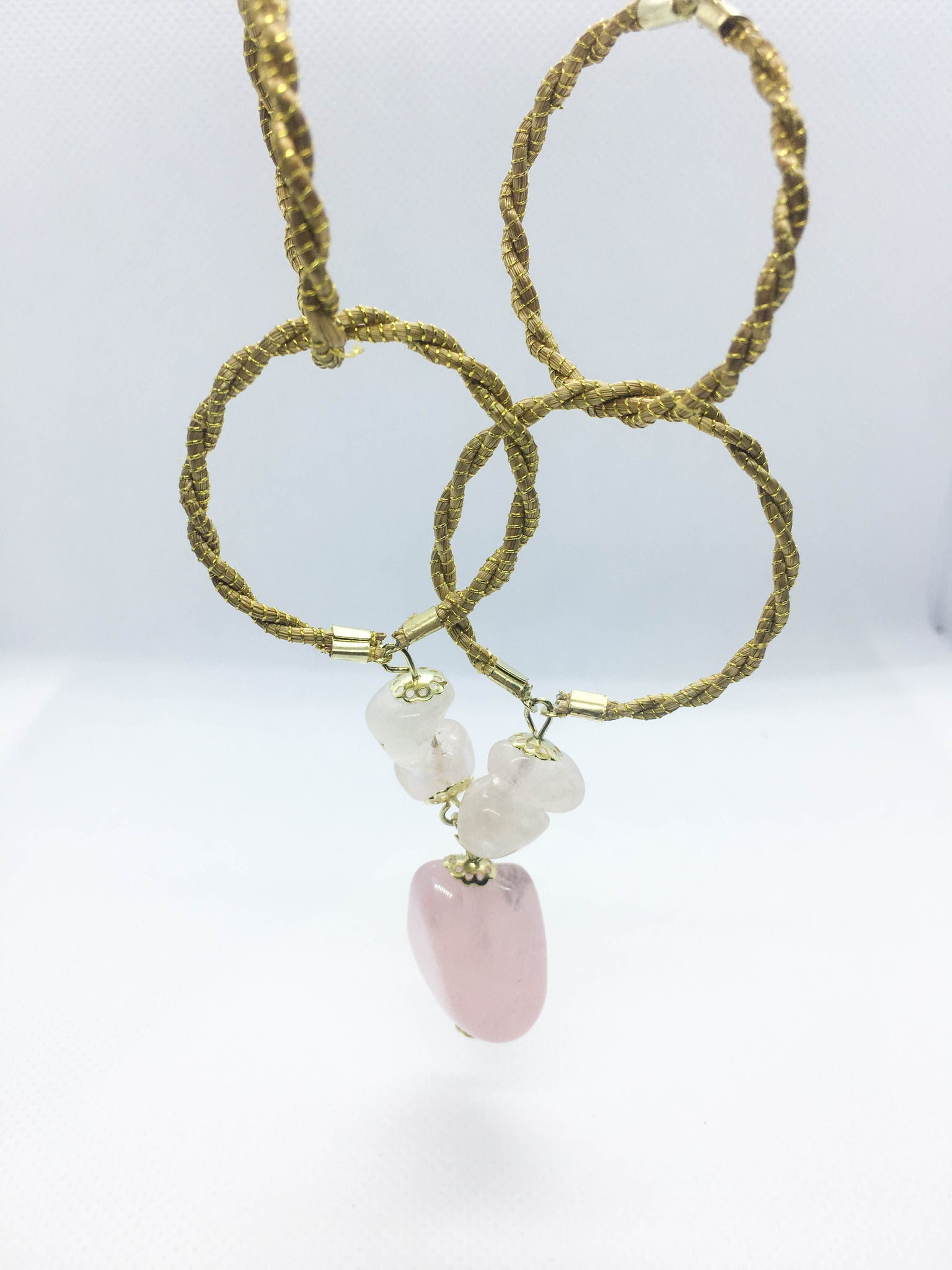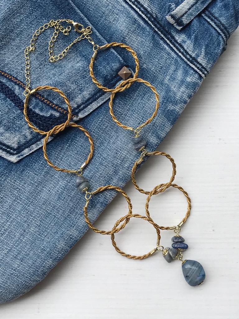 Collana con multiplici cerchi concatenati in Capim Dourado con chips di pietre dure lisce, ciondolo chips di pietre dure e sasso pietre dure lisce